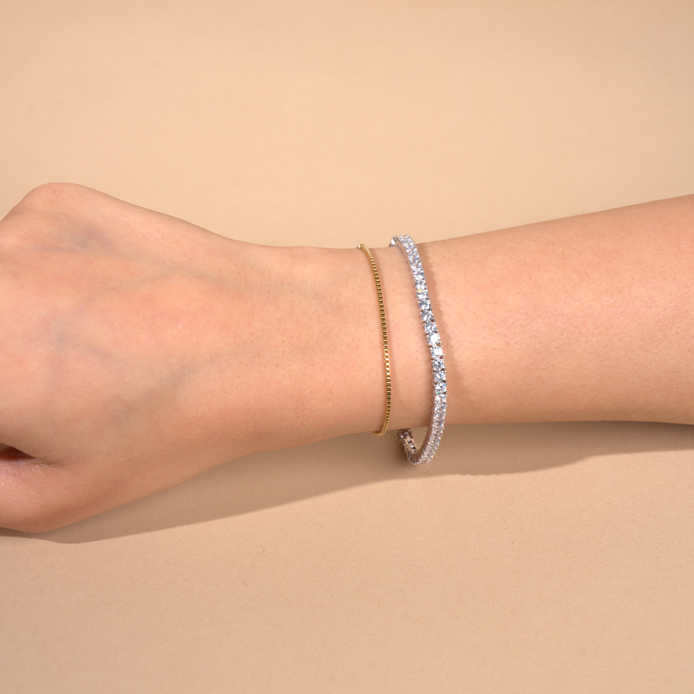 سوار تنس مطلي بالذهب الأبيض, يتميز بتصميم السولتير الساحر، مزينة بزركون نقي لامع, مطلي بالروديوم الأصلي لضمان أناقة خالدة تعزز أي إطلالة, تم اختيار كل حجر زركون بعناية لبريقه ونقائه ليمنح تأثيرا ساحرا يلتقط الضوء من كل زاوية، تم تصميم السوار ليمنح الراحة والأناقة مما يجعله مثالياً للمناسبات الخاصة والإستخدام اليومي.