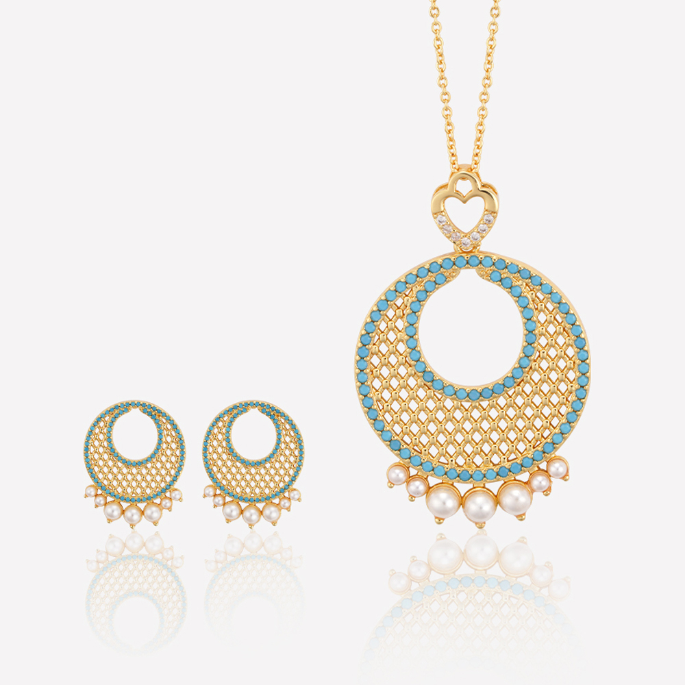 طقم توركواز مون، طقم قلادة وأقراط مطلية بالذهب الأصفر، يتميز بحجر تركواز ناعم مع لؤلؤة دائرية بسيطة. بتصميمه الأنيق والبسيط، يضيف هذا الطقم لمسة رقيقة من الأناقة لمظهرك اليومي أو لمناسباتك الخاصة.