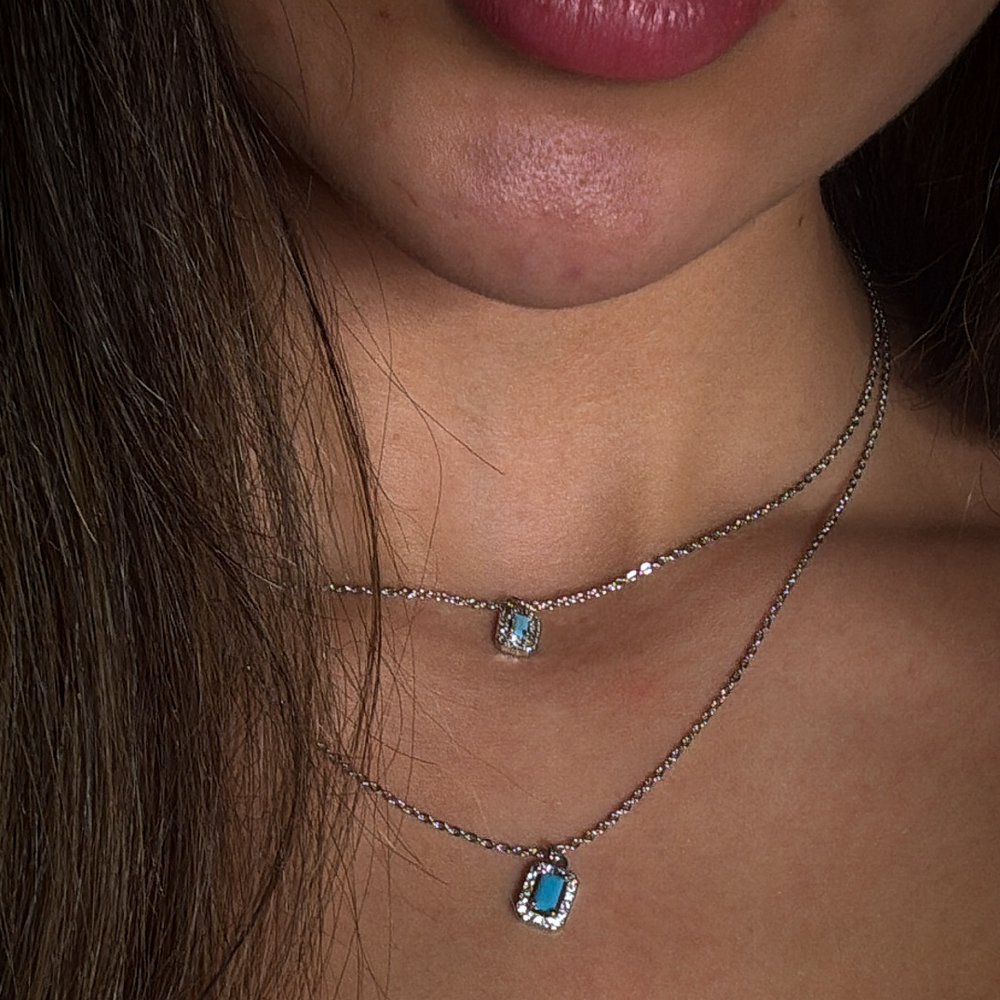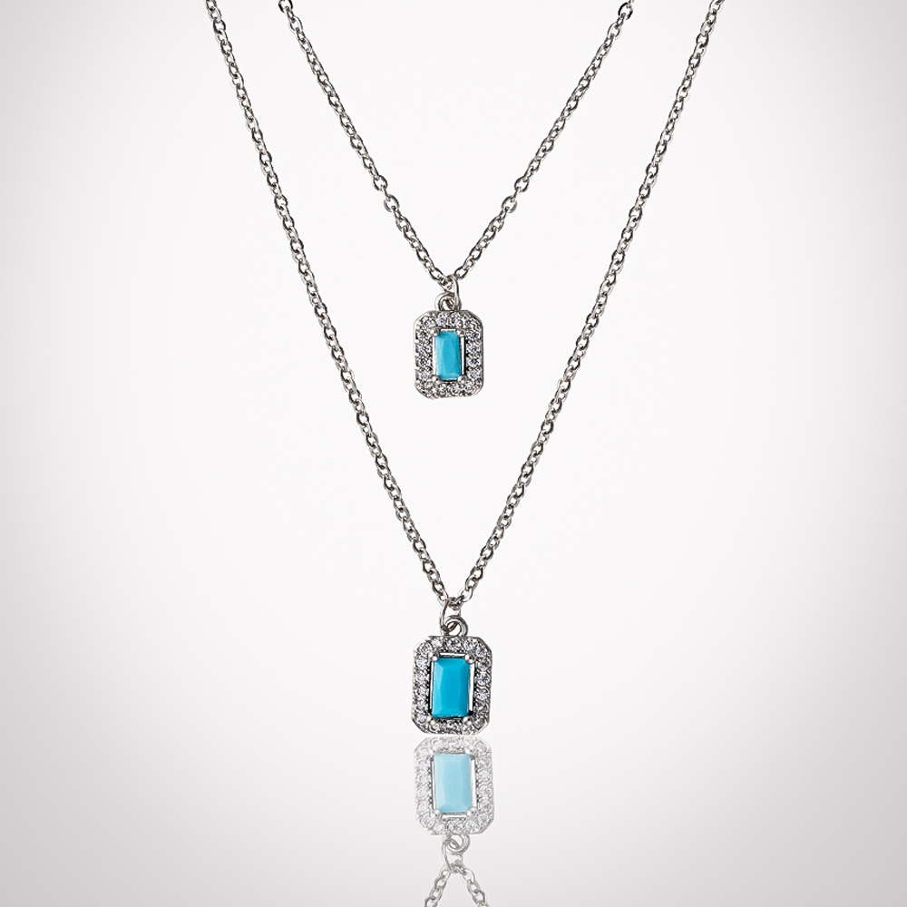 قلادة بطبقة مزدوجة مطلية بالذهب الأبيض بتصميم حجر تركواز شكل زمرد ومزينة بأحجار الزركون النقية لإضافة لمسة من الأناقة على أي إطلالة، مع طبقات رقيقة تمنح مظهراً جذاباً، مما يجعلها هدية مثالية لجميع المناسبات والذكرى السنوية ويوم الحب أو لمفاجأة شخص عزيز، كما أنها مطلية بالروديوم للحفاظ على جودة اللون ولمعان يدوم طويلاً.