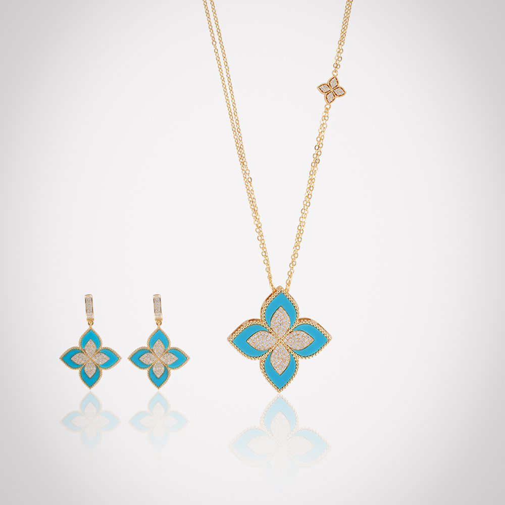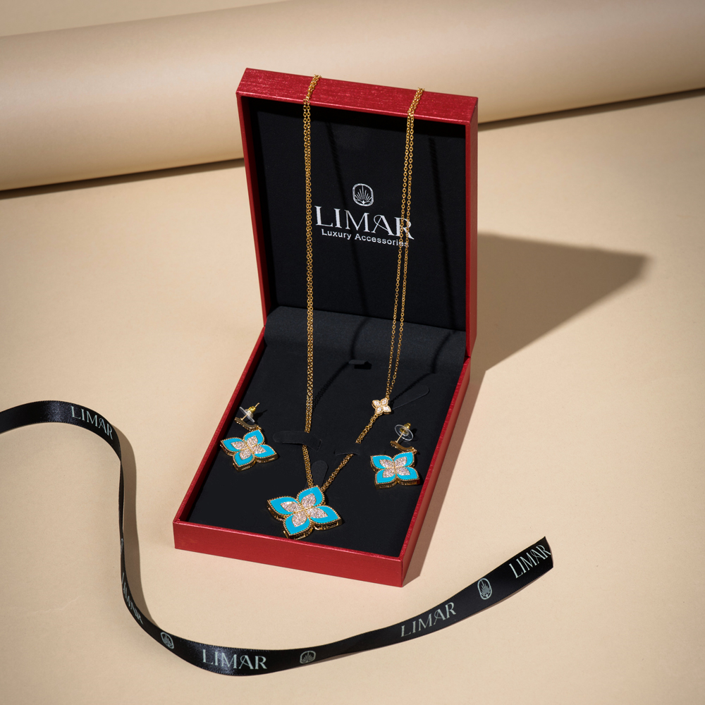 عقد طويل واقراط مطلية بالذهب الاصفر تتميز هذه القطعة البديعة بزركون نقي لامع ولون الفيروز حيث يتم اختيار كل حجر زركون بعناية ليعكس الضوء من كل اتجاه مما يجمع بين الاناقة العصرية والاسلوب الراقي ويجعل هذا الطقم لافتا في كل مناسبة ويضفي لمسة فاخرة على مجموعتك من المجوهرات ويبرز جمالك الخالد مع هذه الاكسسوارات الجذابة.