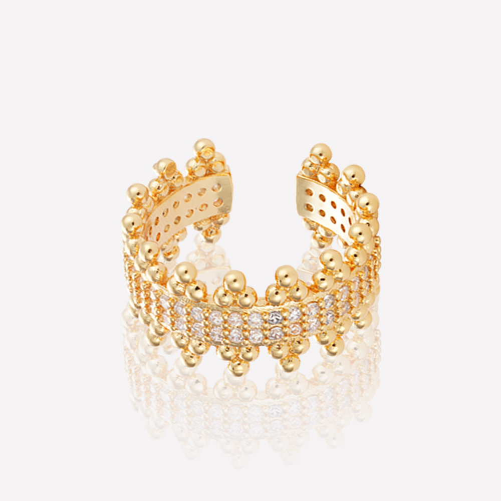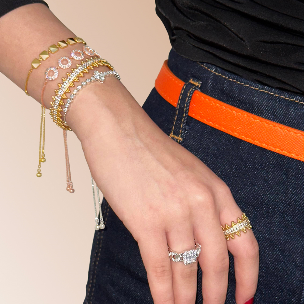 سوار مطلي بالذهب الأصفر على شكل حلقة مفتوحة مع أحجار الزركون. ارتق بأسلوبك مع هذا السوار الرائع المطلي بالذهب الأصفر، المصمم بشكل حلقة مفتوحة لإطلالة عصرية. مرصع بأحجار الزركون عالية الجودة والملونة، ليضفي توهجاً ذهبباً دافئاً ولمسة بريق خالدة. مثالي للمناسبات الرسمية أو كهدية مميزة للإحتفالات الخاصة. هذا السوار يجسد أناقة التصاميم الحديثة للمجوهرات.
