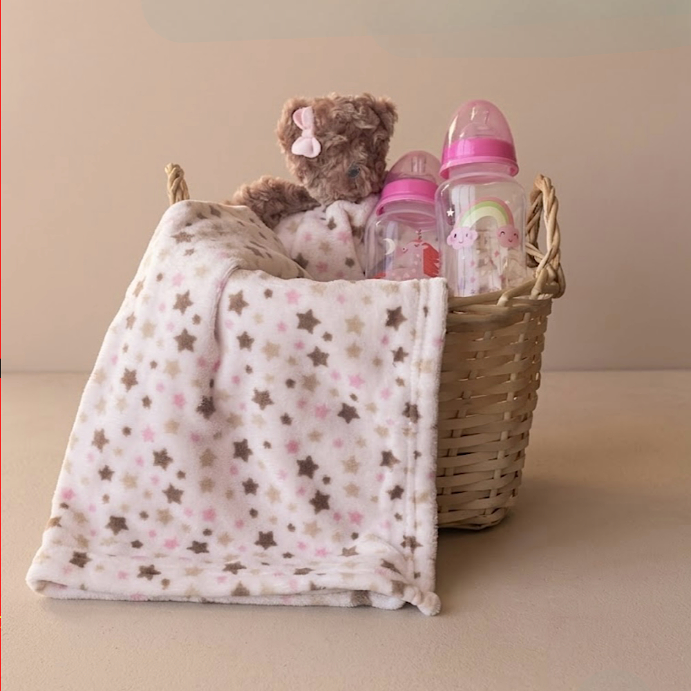 السله تحتوي على بطانية صغيره للاطفال مع عدد 2 من رضاعه بلاستك باللون الوردي.