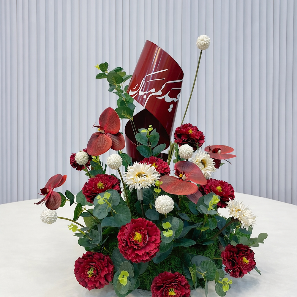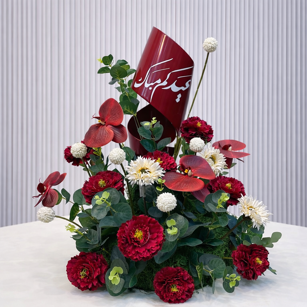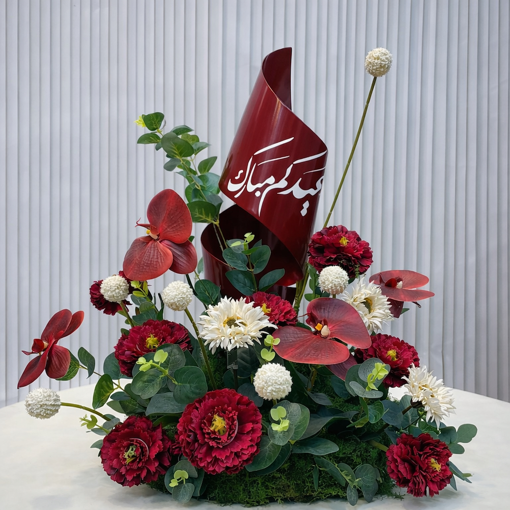 قطعة زهور أنيقة بتصميم دائري مع قطعة حلزونية ملونة من الستانلس ستيل تحمل عبارة "عيد مبارك"، مزينة بأزهار ناعمة لتضيف لمسة ساحرة لديكور العيد.