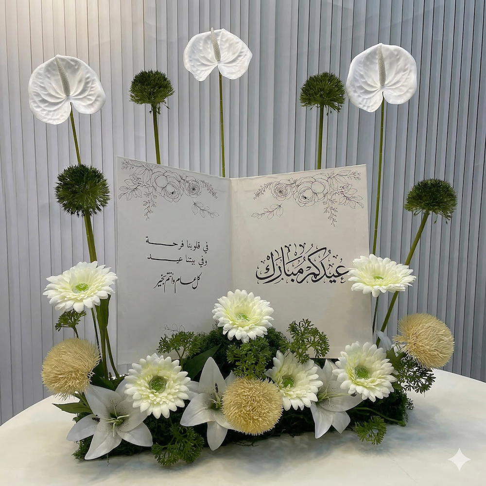 قطعة زهور أنيقة بتصميم كتاب مفتوح يحمل عبارة "عيد مبارك"، محاطة بأزهار باللون الأبيض وأوراق خضراء طبيعية لتمنح لمسة راقية واحتفالية لديكور العيد.