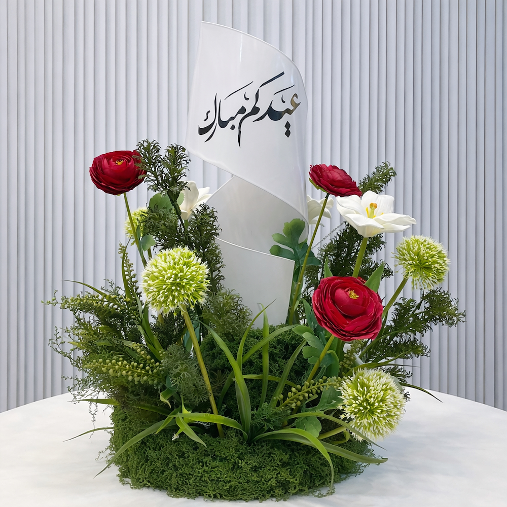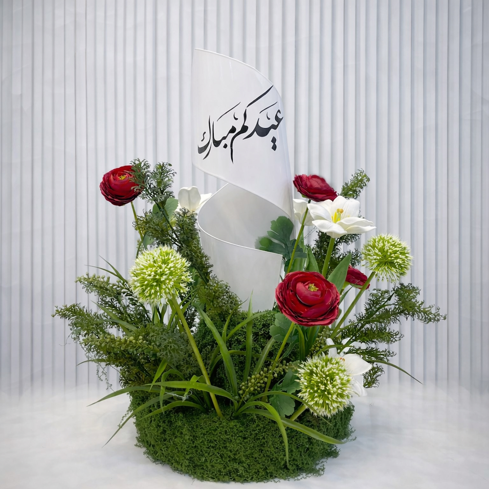 قطعة زهور أنيقة بتصميم دائري مع قطعة حلزونية ملونة من الستانلس ستيل تحمل عبارة "عيد مبارك"، مزينة بأزهار ناعمة لتضيف لمسة ساحرة لديكور العيد.