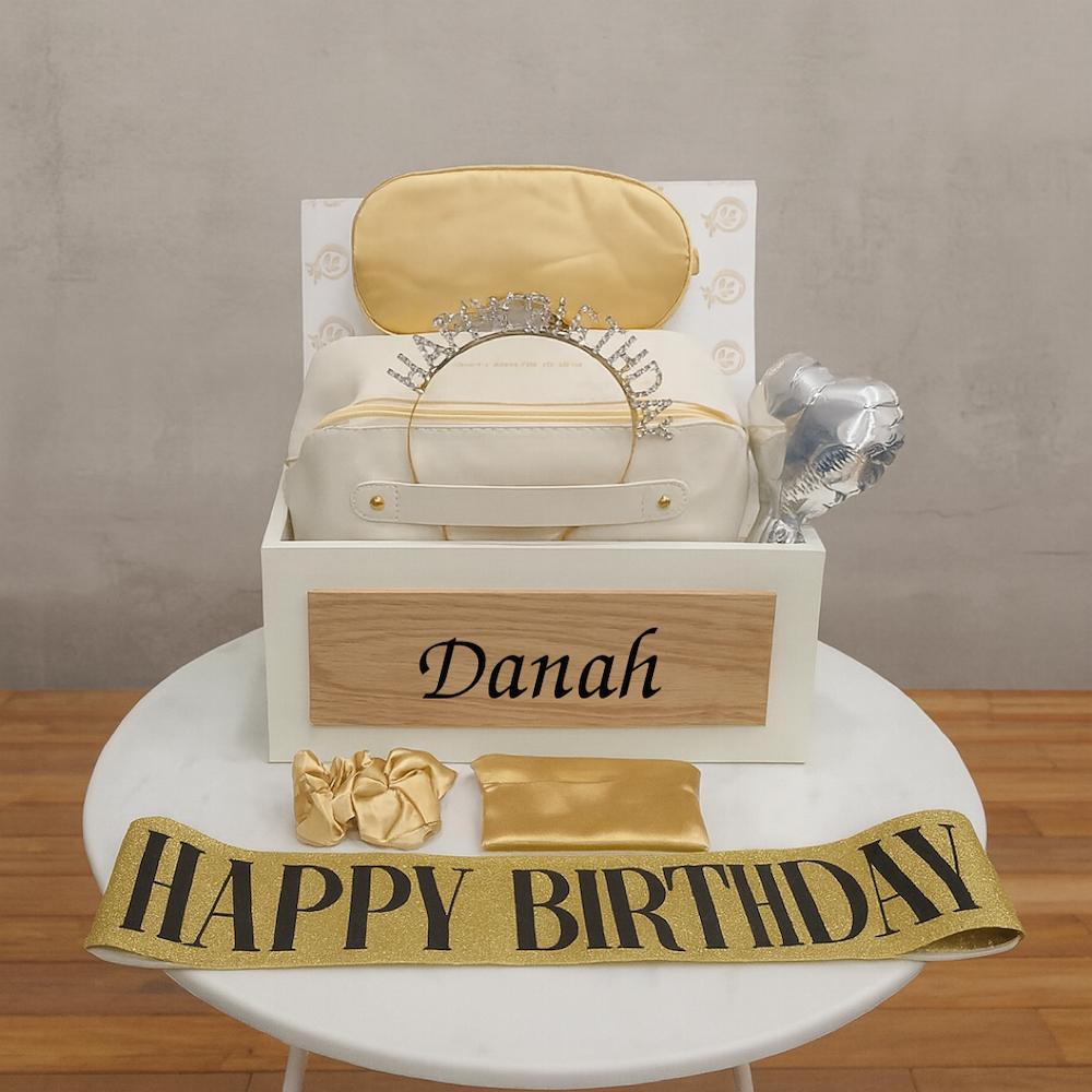 هدية مميزة تحتوي على حقيبة مكياج، ربطة رأس، قناع العين، ربطة شعر، ووشاح مع تغليف أنيق بداخل صندوق خشبي، مع إمكانية طباعة الاسم على الصندوق.