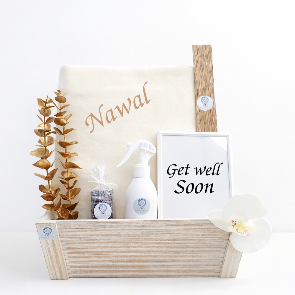 تحتوي هذه الهدية المميزة على بطانية مع الشوكولاتة، مرش وبخور، مغلفة بتغليف مميز داخل سلة. يمكن تخصيص الإسم على البطانية.