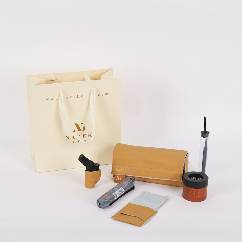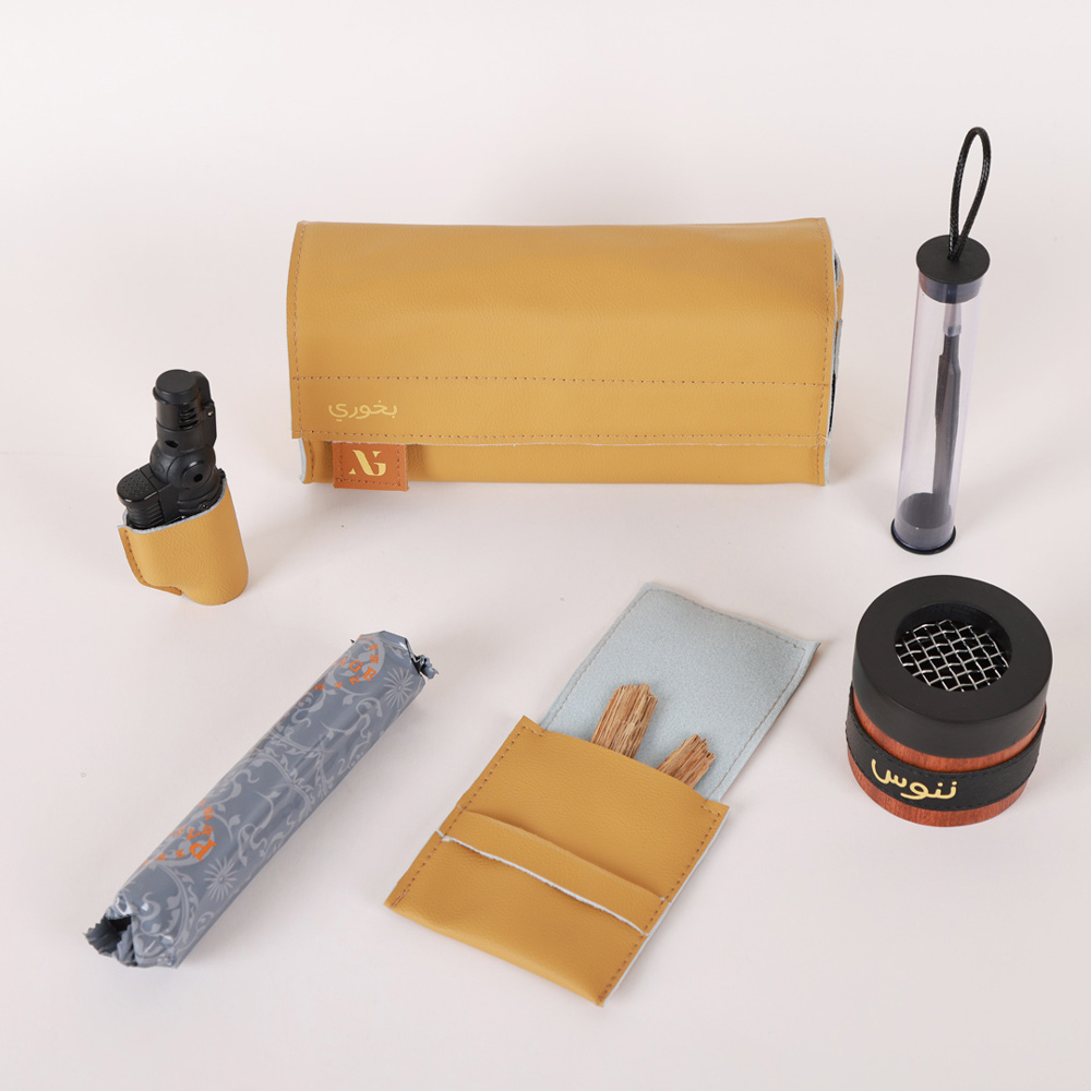 حقيبة بخور من الجلد تحتوي على مبخرة خشبية آمنة بغطاء محكم، مناسبة لتعطير الملابس والشعر بأمان. تحتوي الحقيبة على فحم صغير الحجم، ولاعة، غلاف من الجلد لتخزين البخور وملقط الفحم، مع إمكانية كتابة إسم على المبخر.
