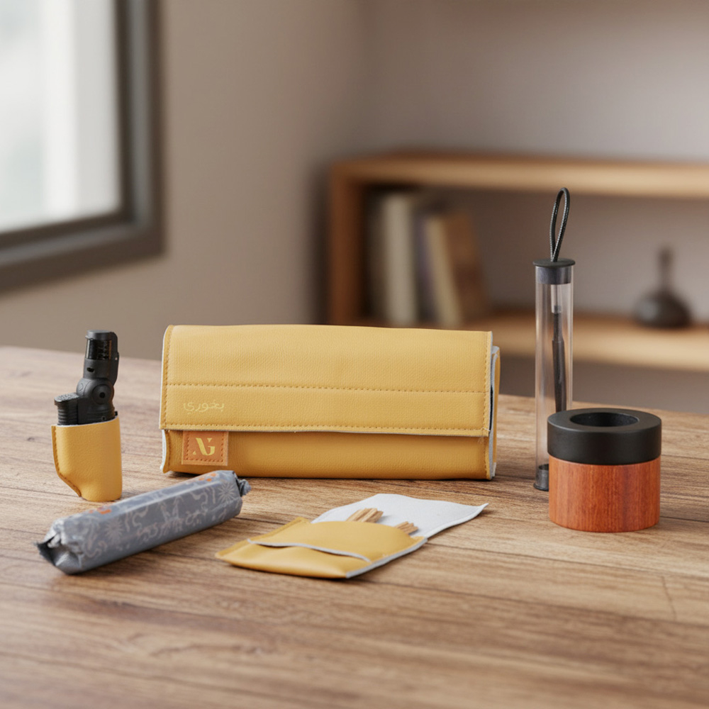 حقيبة بخور من الجلد تحتوي على: مبخرة خشبية آمنة بغطاء محكم، مناسبة لتعطير الملابس والشعر بأمان. تحتوي الحقيبة على فحم صغير الحجم، ولاعة، غلاف من الجلد لتخزين البخور وملقط الفحم.