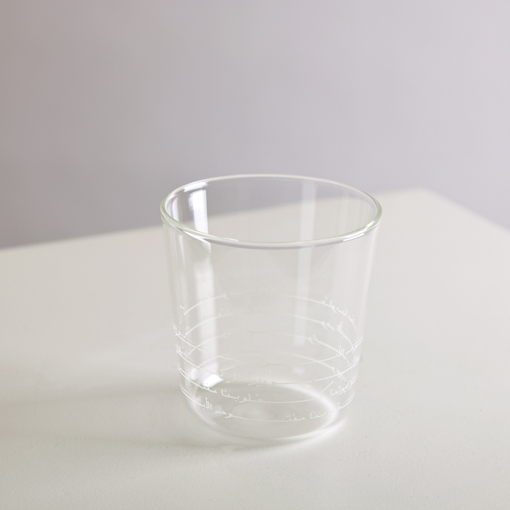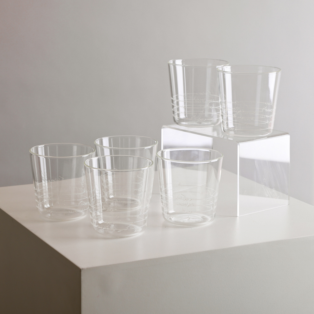 مجموعة مكونة من 6 أكواب زجاجية أنيقة، مطبوع عليها عبارة عربية (بيوتنا كقلوبنا مفتوحة الأبواب). مثالية لتقديم المشروبات الباردة مع لمسة من الدفء والضيافة.