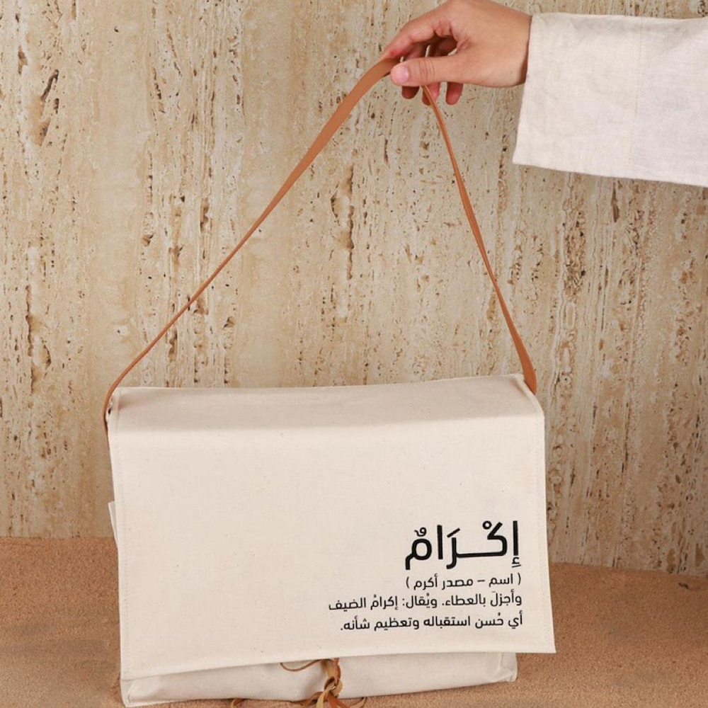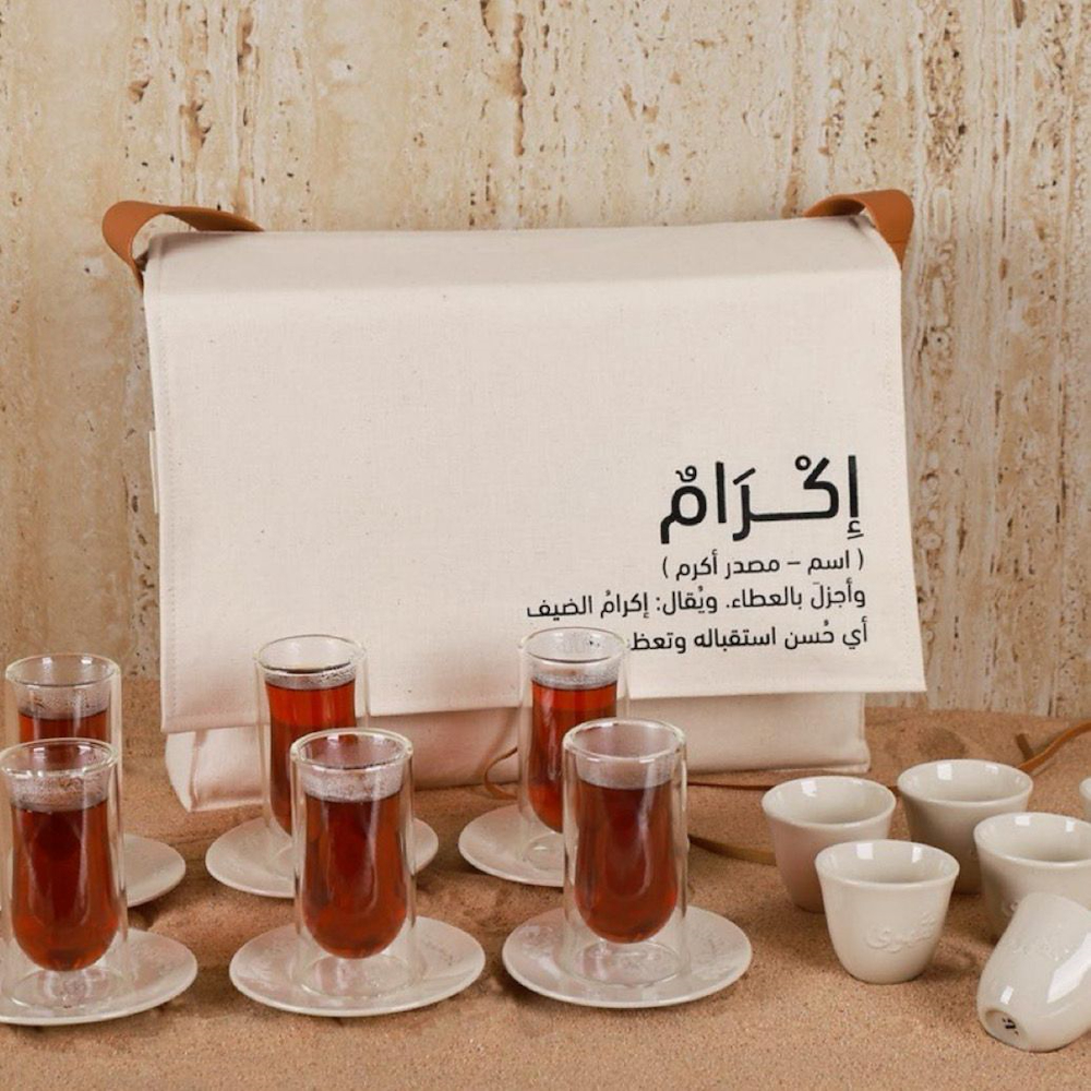 مجموعة ضيافة فاخرة في حقيبة أنيقة تحمل عبارة عن معنى الإكرام والضيافة. تحتوي المجموعة على 6 صحون فخارية مصنوعة يدوياً مع عبارة(لم يدر ما لذة الدنيا وزينتها من لم يكن من كؤوس الشاي قد شرب)، و6 أكواب شاي من الزجاج المزدوج للحفاظ على حرارة المشروب، بالإضافة إلى 6 أكواب قهوة عربية فخارية مكتوب عليها «تقهوى». مزيج مثالي للأصالة والعملية في تقديم الشاي والقهوة بأسلوب راقي.