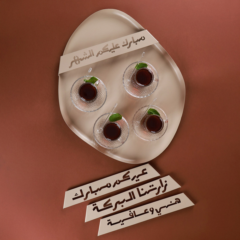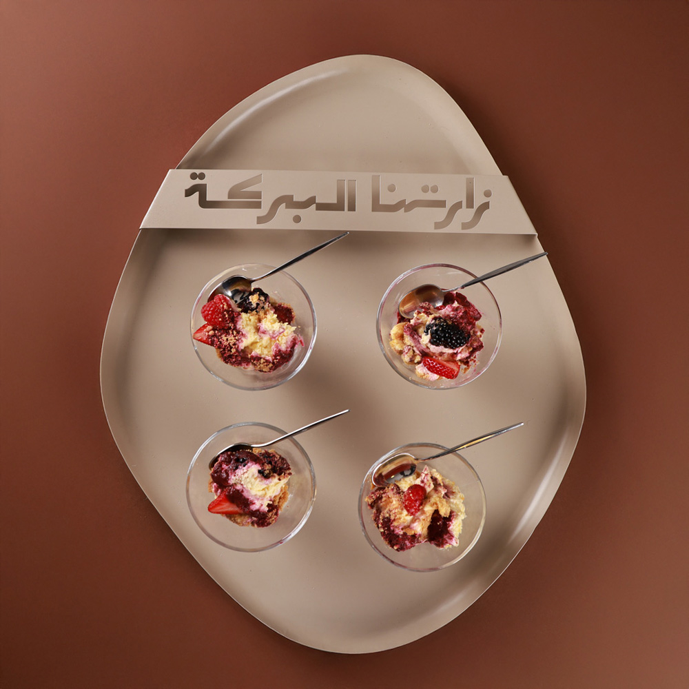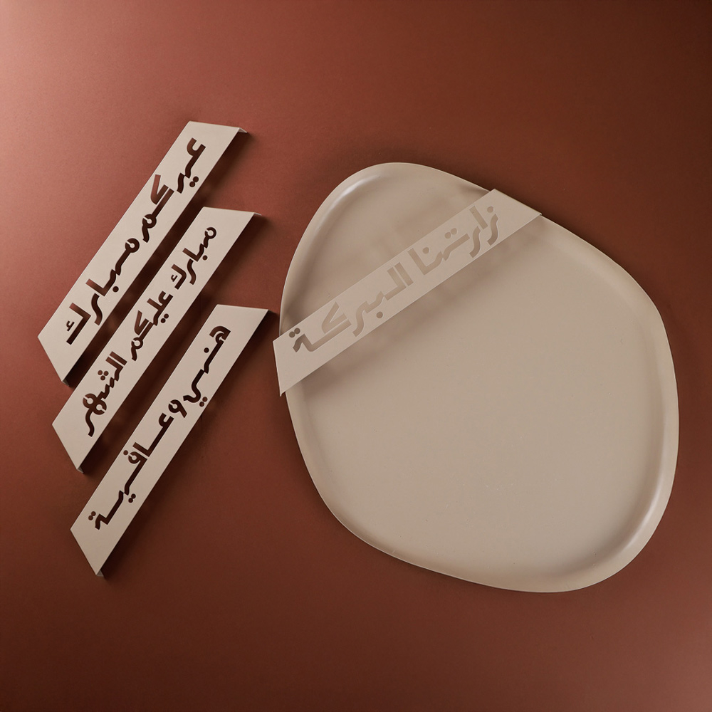 صينية تقديم معدنية أنيقة وعصرية، منقوشة بأربع عبارات ترحيبية دافئة باللغة العربية. مثالية لإضفاء لمسة من الدفء والضيافة على مناسباتكم الخاصة. مقاس الصينية: 50 × 41 سم.