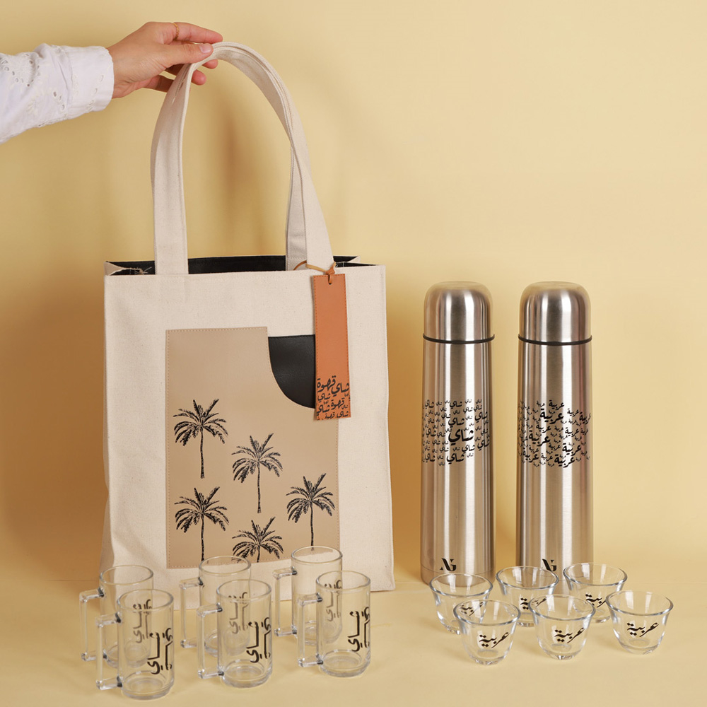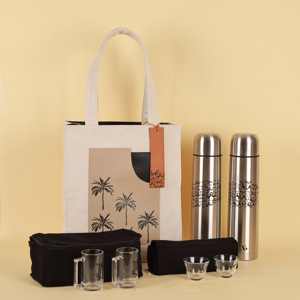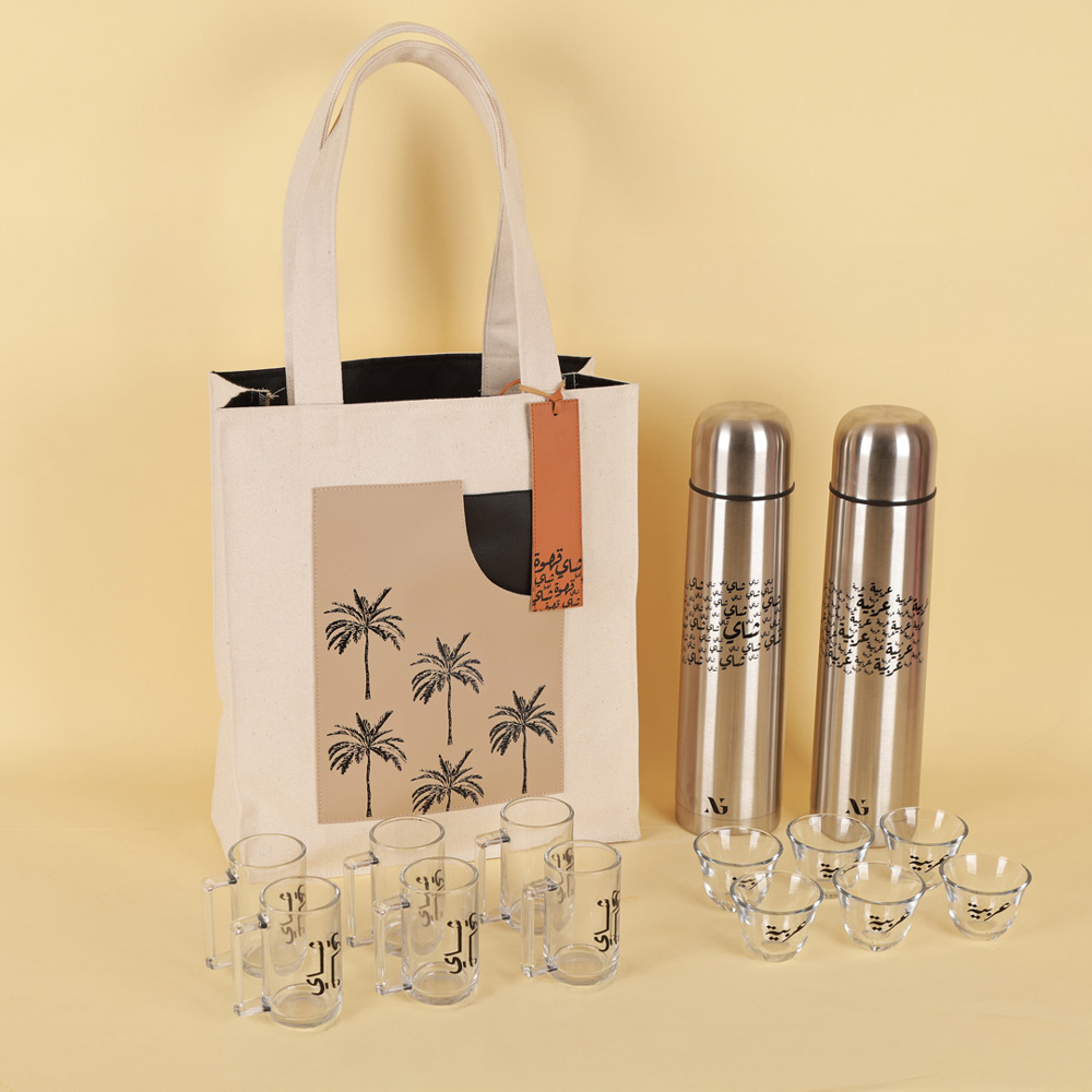 حقيبة قماشية بلمسات جلدية، تحمل طبعة نخلة ورقعة جلدية. صممت الحقيبة لحمل ترمس شاي وقهوة عربية، بالإضافة إلى أكواب وكؤوس. تحتوي المجموعة على 6 أكواب شاي بمقابض مطبوعة عليها كلمة "شاي" باللغة العربية، و6 أكواب قهوة مطبوعة عليها كلمة "عربية". ترمس الشاي يحتفظ بالحرارة لأكثر من 12 ساعة، مطبوع عليه كلمة "شاي"، وترمس القهوة العربية يحتفظ بالحرارة لأكثر من 12 ساعة، مطبوع عليه كلمة "عربية"، بسعة 1 لتر لكل منهما.