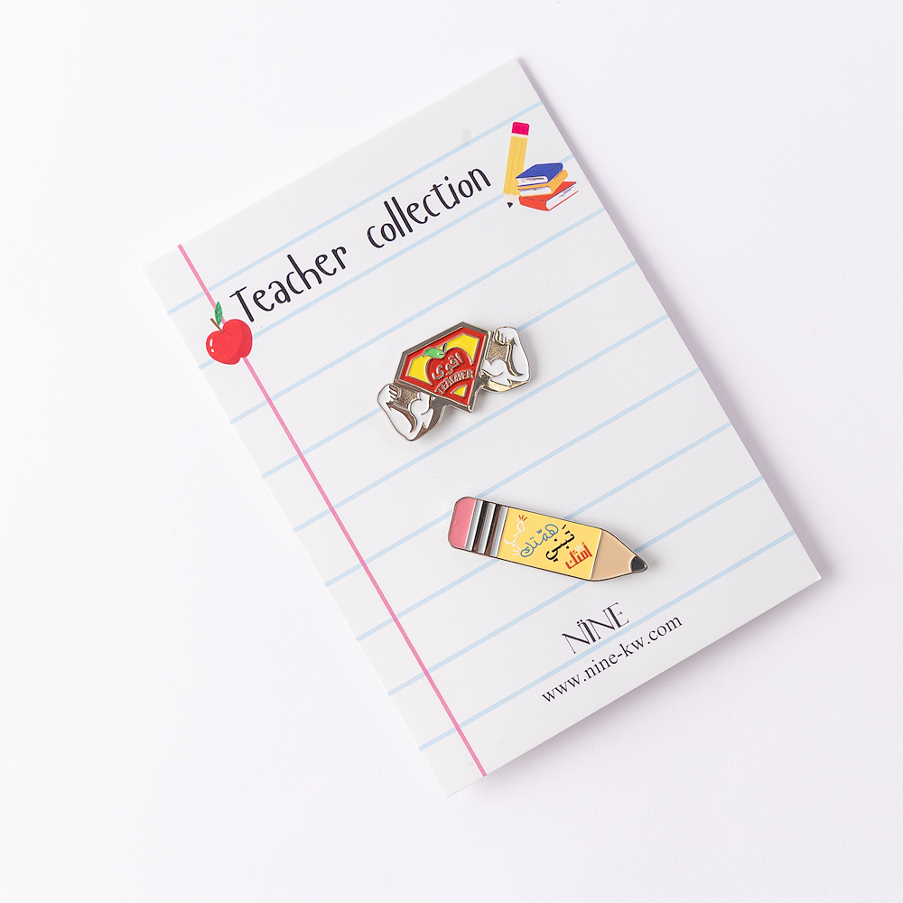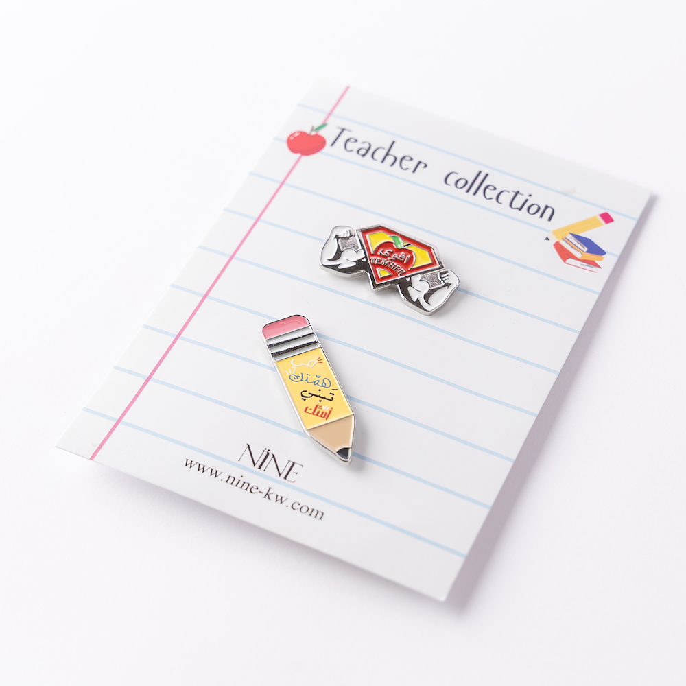 بروش معدني انيق بتصميم خاص ليوم المعلم باللغة العربية عدد اثنين.