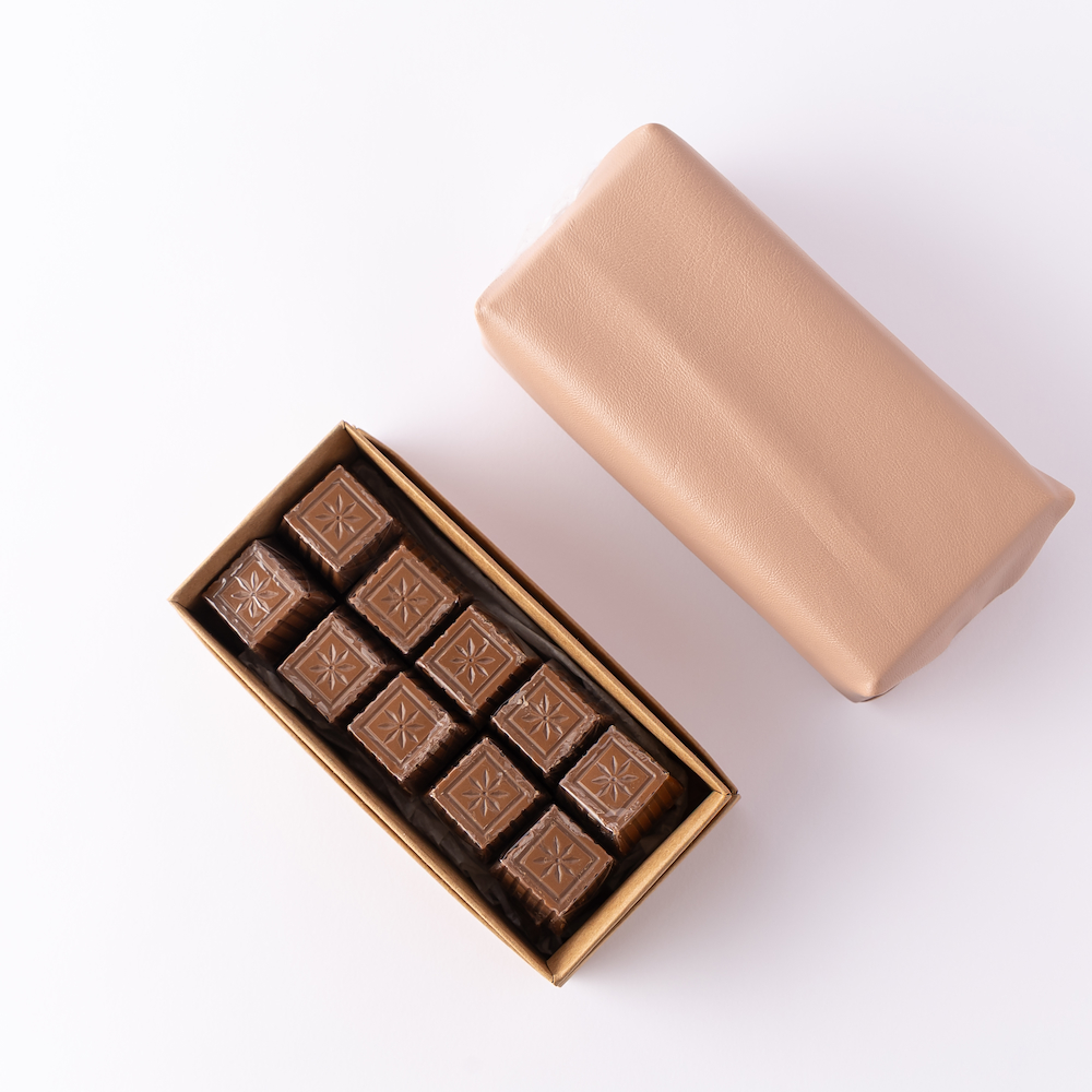 بوكس أكريليك أنيق يحتوي على كوب مع الشوكولاتة بتغليف من الجلد.