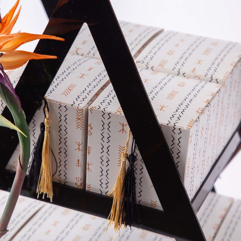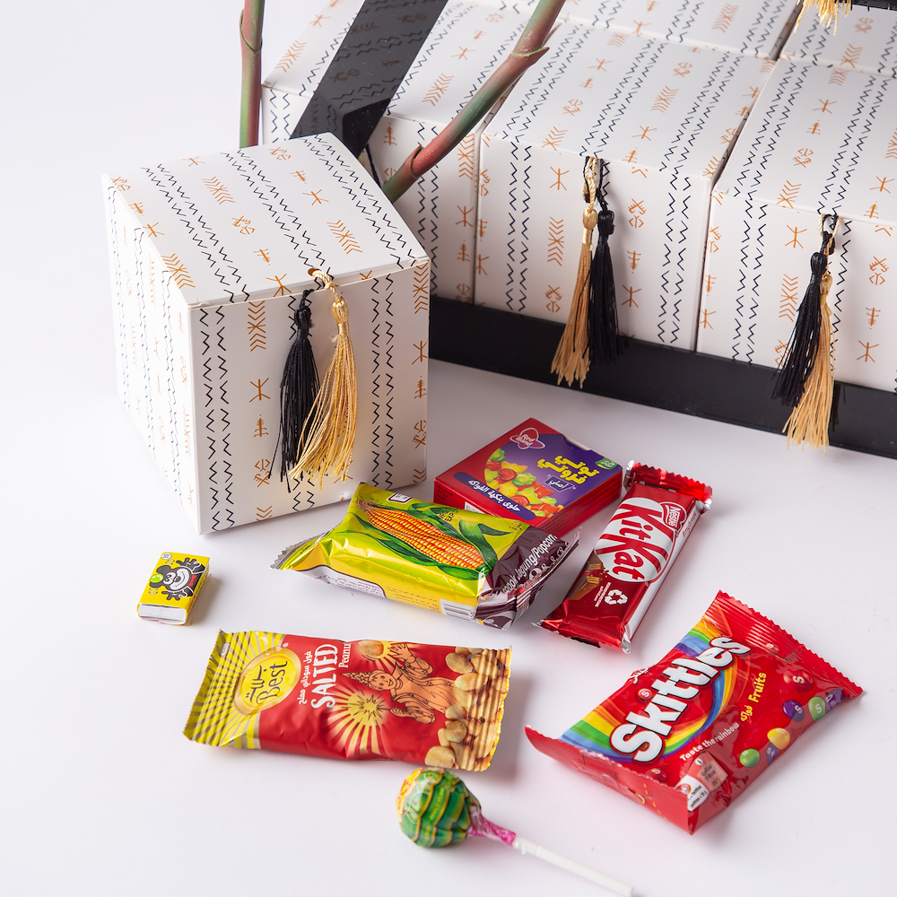 ستاند أكريليك يحتوي على 12 علبة، كل واحدة مليئة بالحلوى اللذيذة. عرض ملون وممتع، مثالي للحفلات أو كهدية.