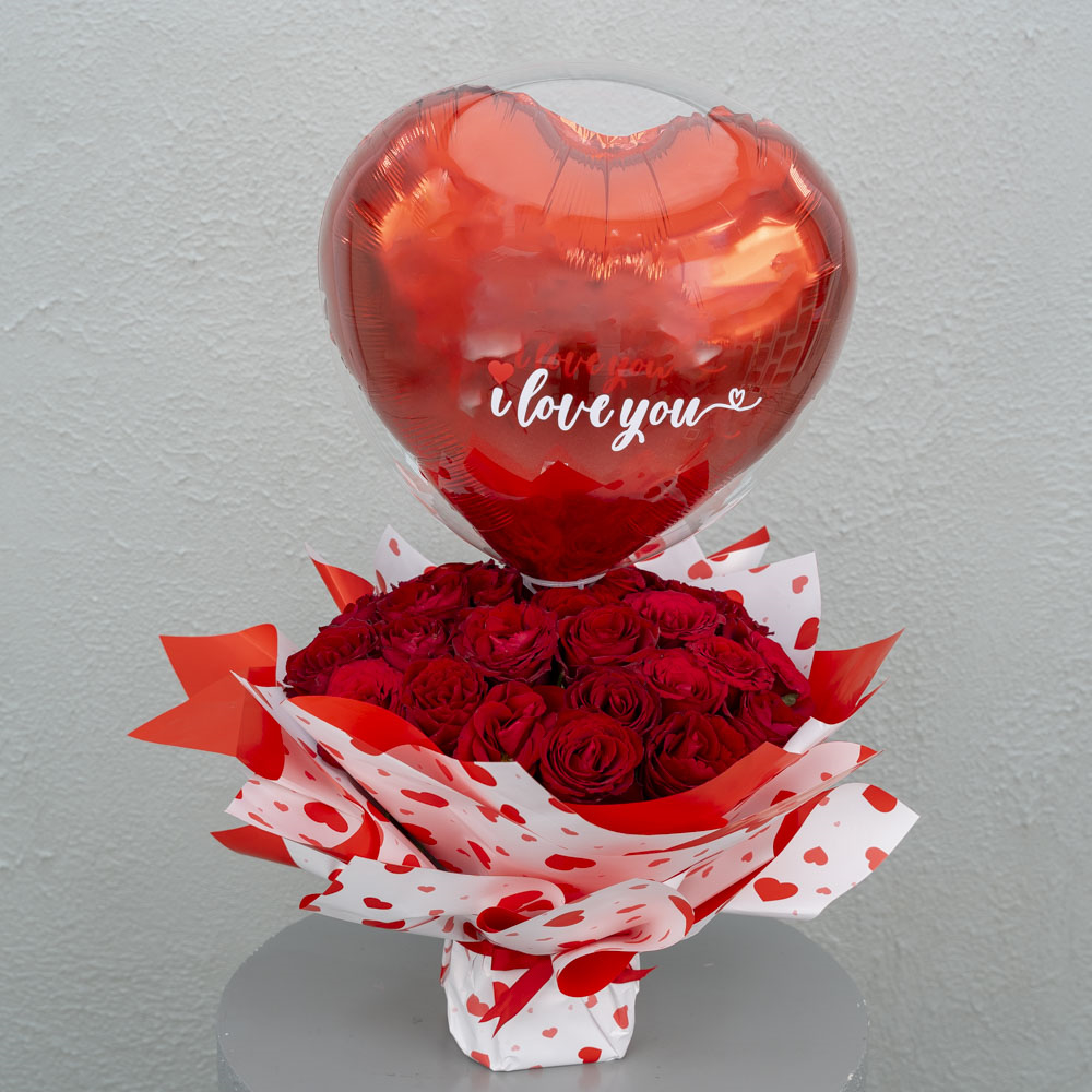 باقة من الجوري مع بالون البوبو.