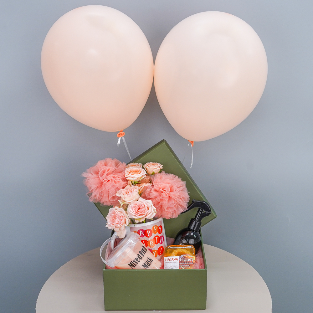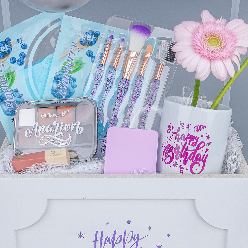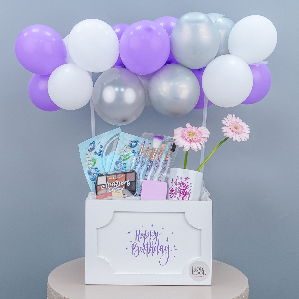 صندوق خشبي مزين بالبالونات يحتوي على كوب مزين بالورود، ومرآة، ومجموعة مكياج وفرش.