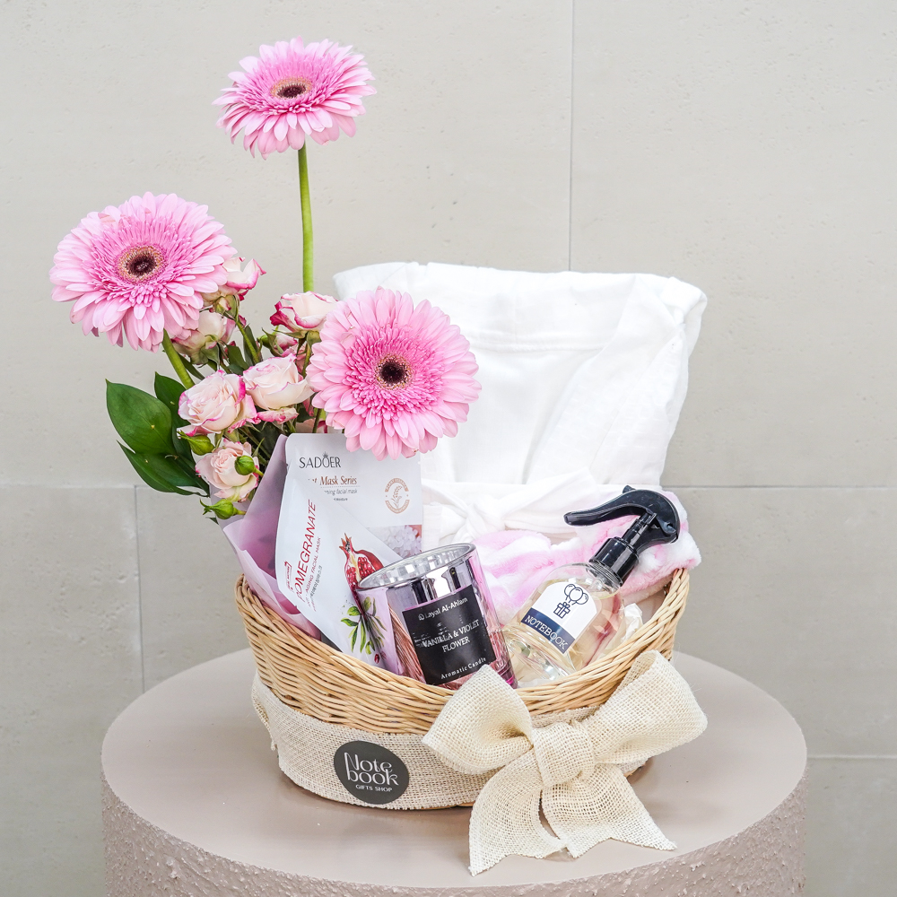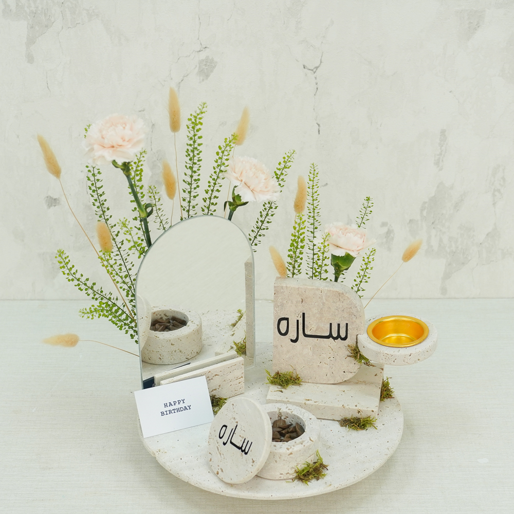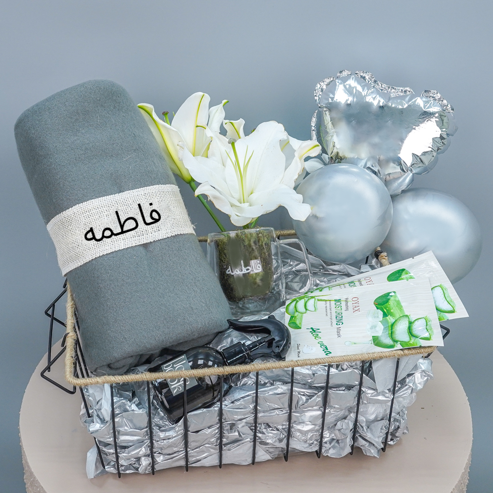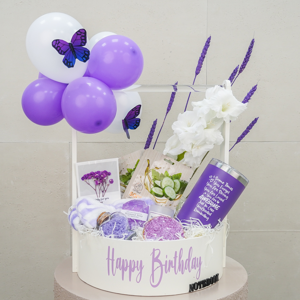 صندوق خشبي مزين بالبالونات يحتوي على كوب مزين بالورود، ومرآة، ومجموعة مكياج وفرش.