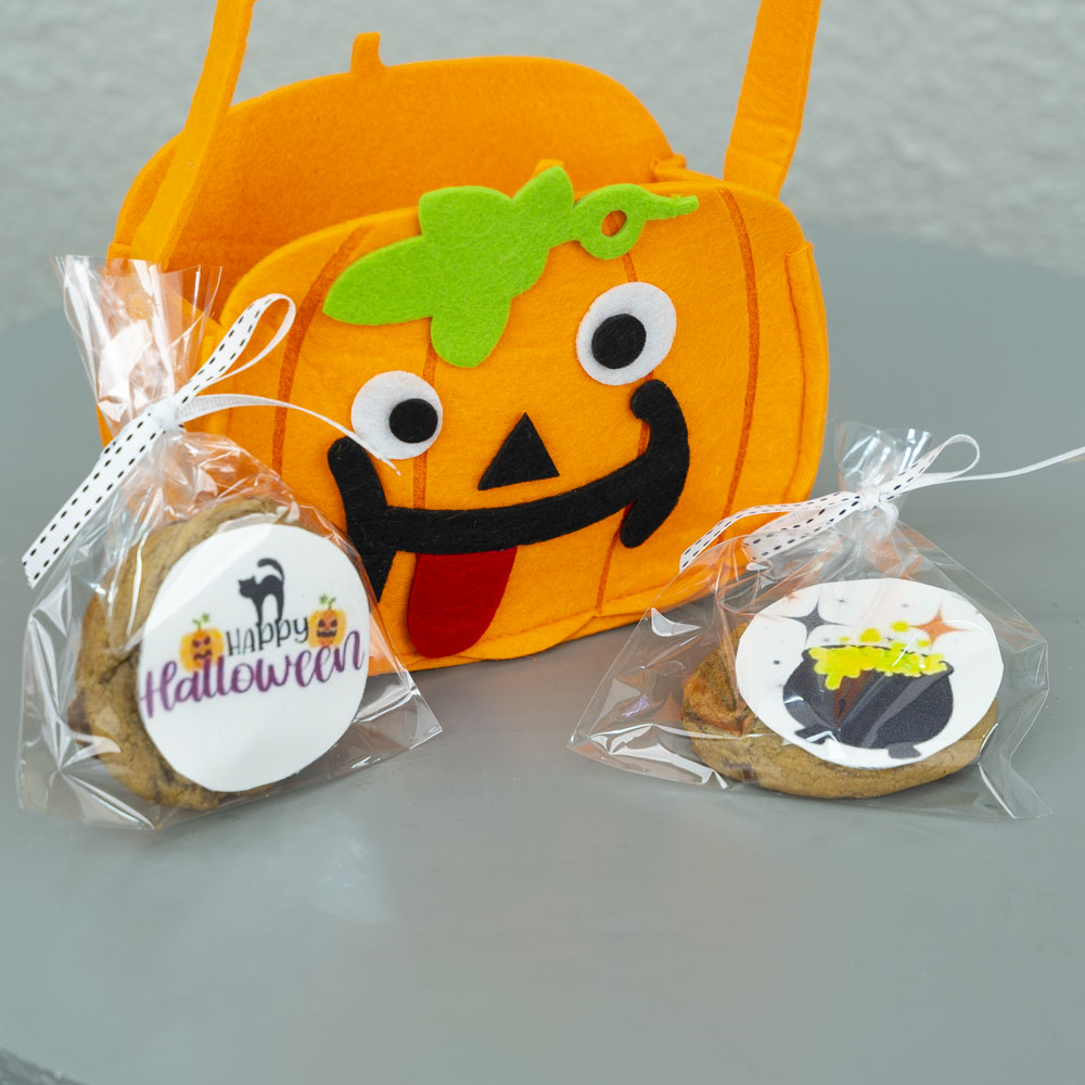 حقيبة اليقطين بتصميم الهالوين تحتوي على 2 من كوكيز رقائق الشوكولاتة.