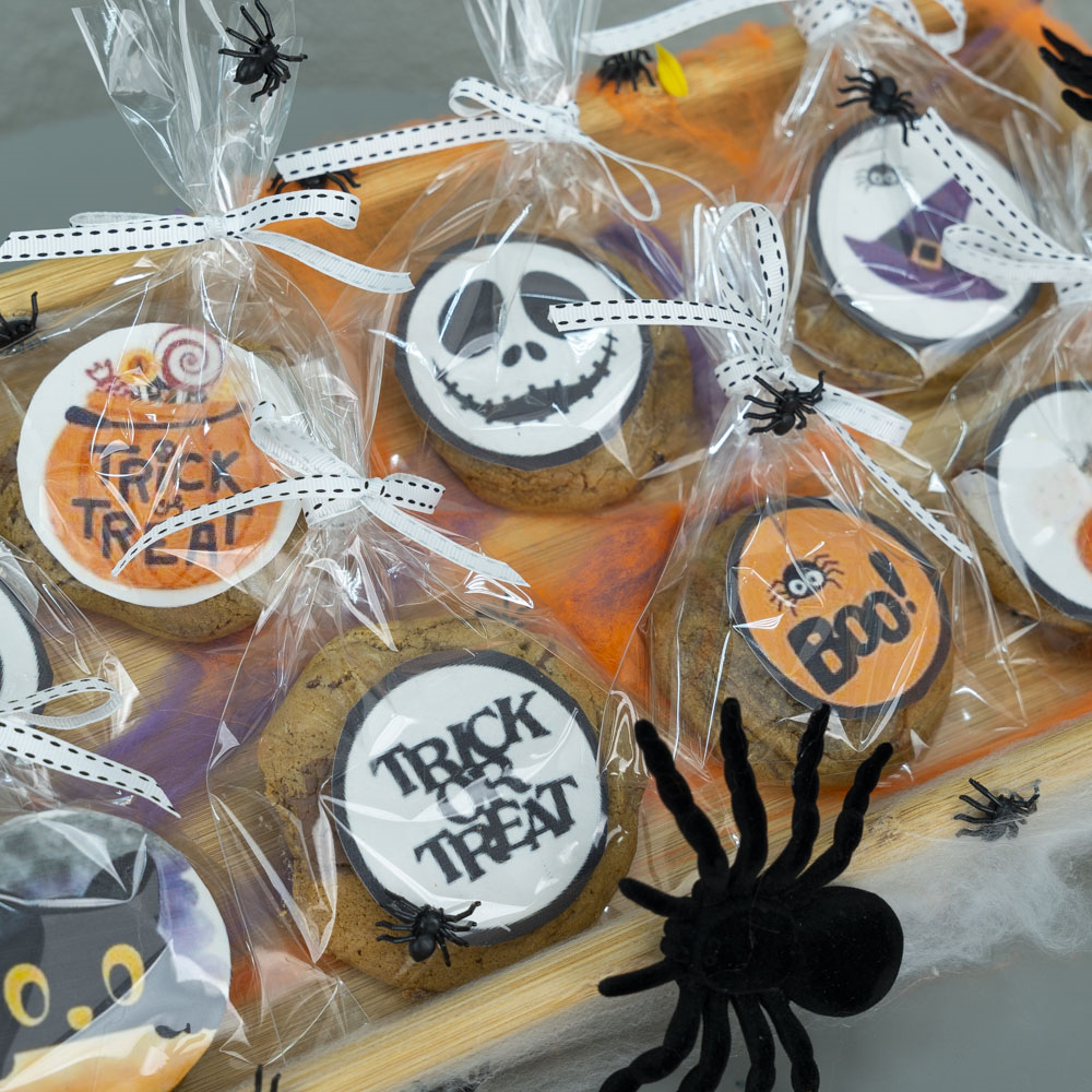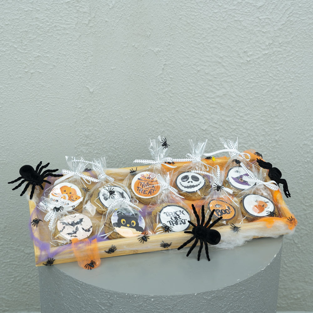 صينية خشبية بتصميم الهالوين تحتوي على 10 قطع من كوكيز رقائق الشوكولاتة.