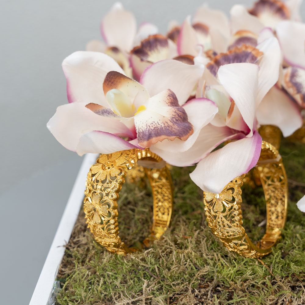 صينية خشبية تحتوي على توزيعات أساور ذهبية مزينة بالزهور الإصطناعية.