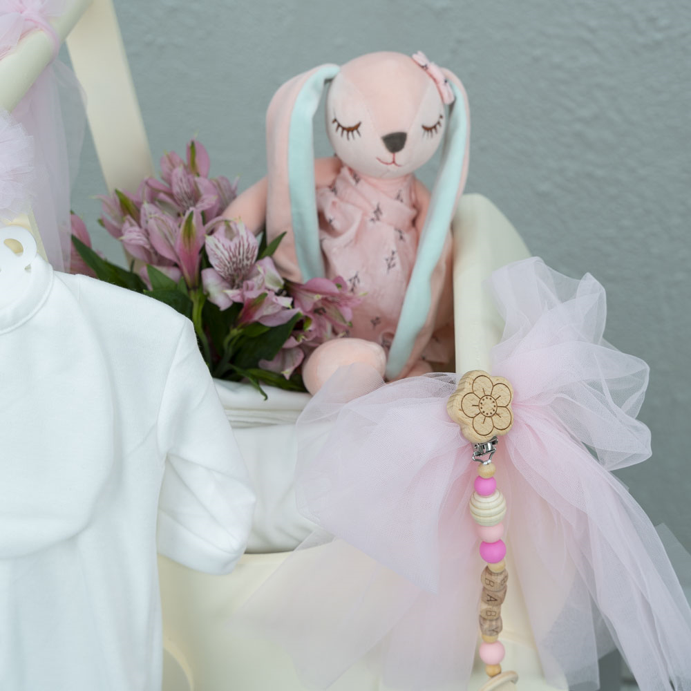 بوكس خشبي يحتوي على مستلزمات الطفل الاساسية.
