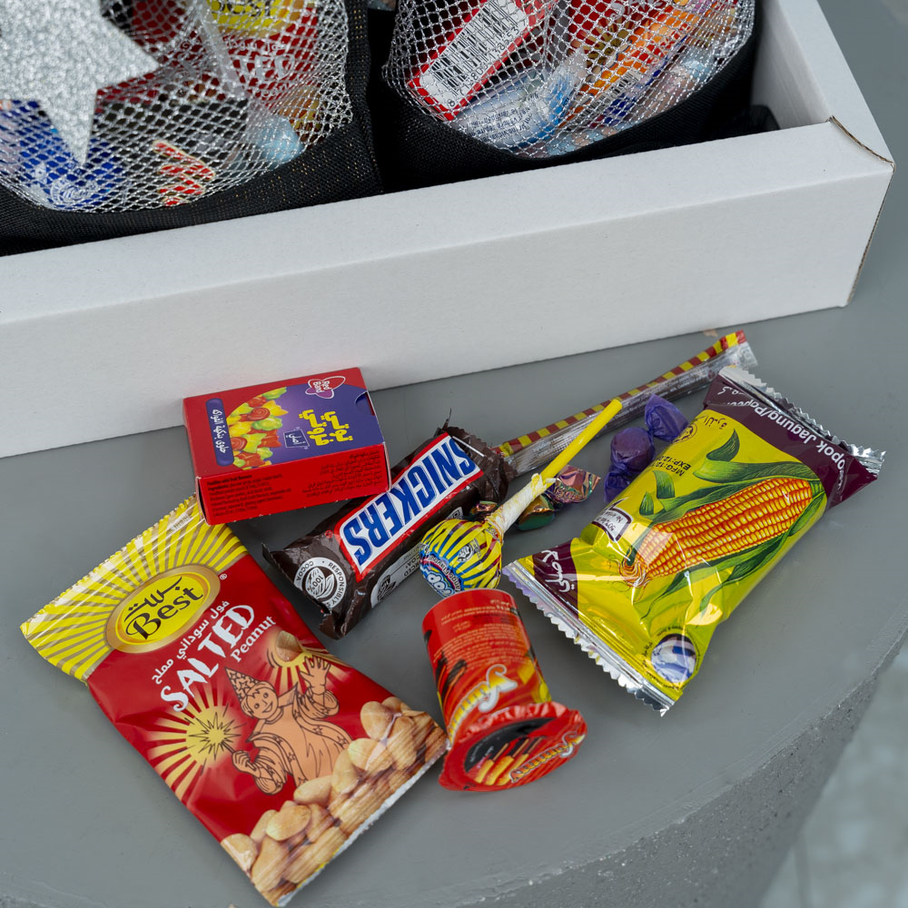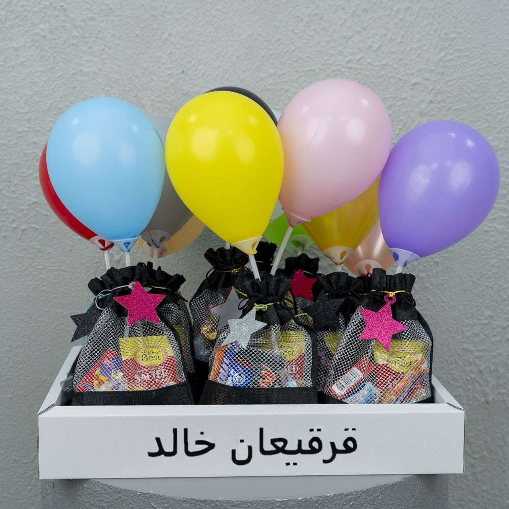 صينية خشبية أنيقة تضم 12 كيس مزيج الحلوى قرقيعان، مع بالون لكل كيس.