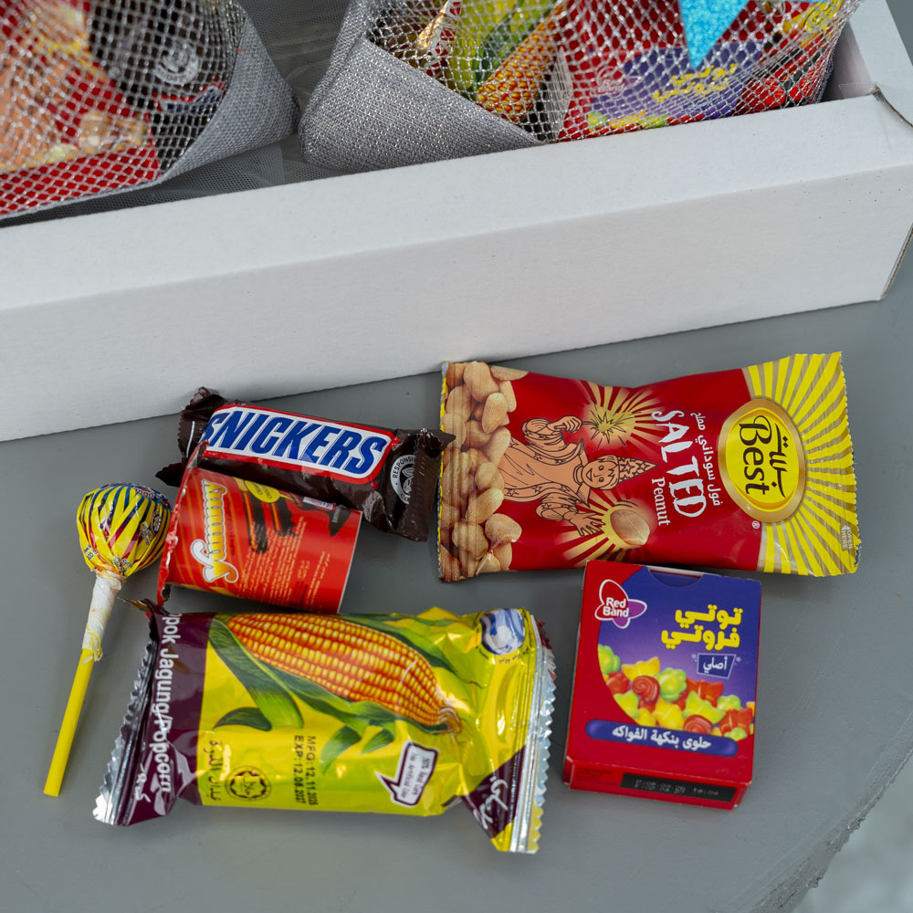 صينية خشبية أنيقة تضم 12 كيس مزيج الحلوى قرقيعان، مع بالون لكل كيس.