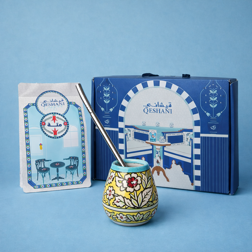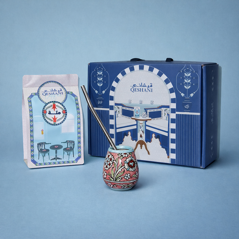 يتكون الصندوق من: - كوب متة يدوي من السيراميك. - مصاصة حديد. - كيس متة 250 جرام. - علبة فاخرة مع كرت مستدير مناسب للإهداء. هدية كاملة متكامة تمزج بين أصالة الخزف القيشاني وعشبة المتّة الصحية، قطعة فاخرة، وتجربة مختلفة، وهدية مثالية لعشاق التميز.