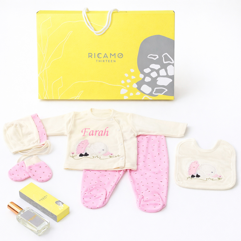هدية مميزة للمواليد تحتوي على بدلة، قبعة، مريلة، قفازات. مع عطر البودر، يمكن تطريز الإسم باللغة الإنجليزية أو العربية (مقاس 0 الى 3 أشهر) مع تغليف مميز للهدية.