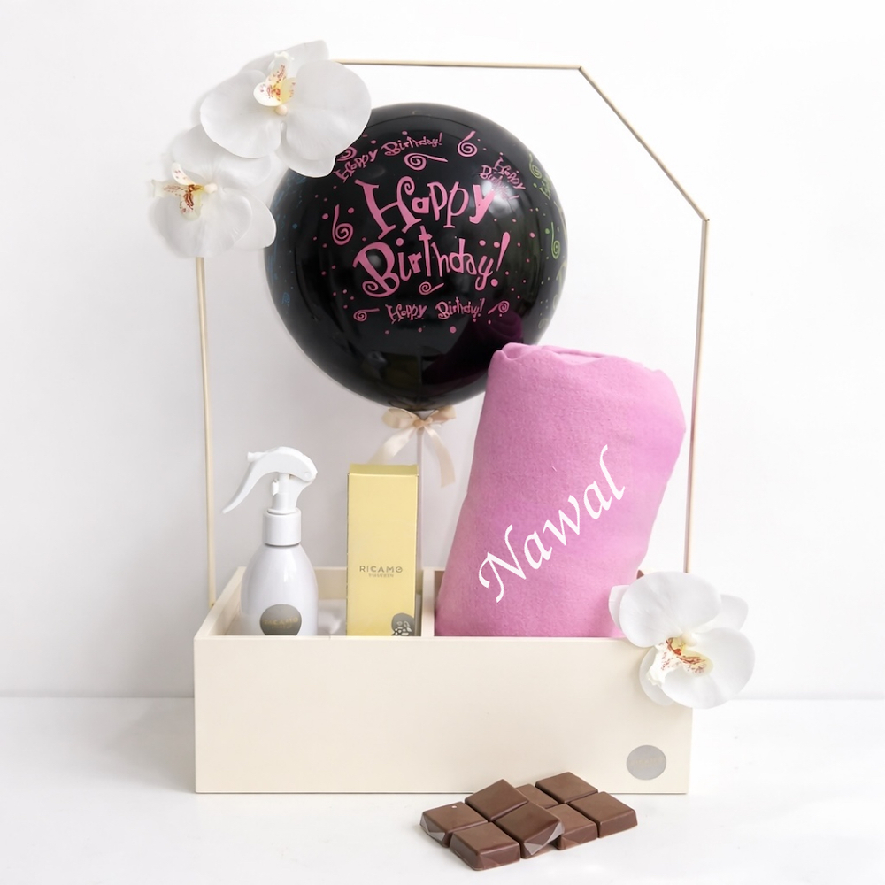 هدية مميزة تحتوي على بطانية مطرز عليها الإسم مع الشوكولاتة ومرش، يتم تنسيقها في ستاند مزين بالأزهار.