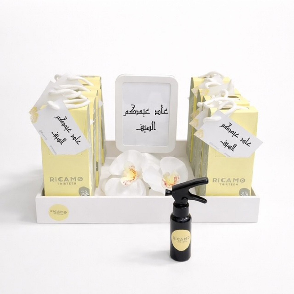 توزيعات المرش يحتوي على 10 علب مرشات مع طباعة مخصصة على كل علبة وتغليف خاص في صينية خشبية.