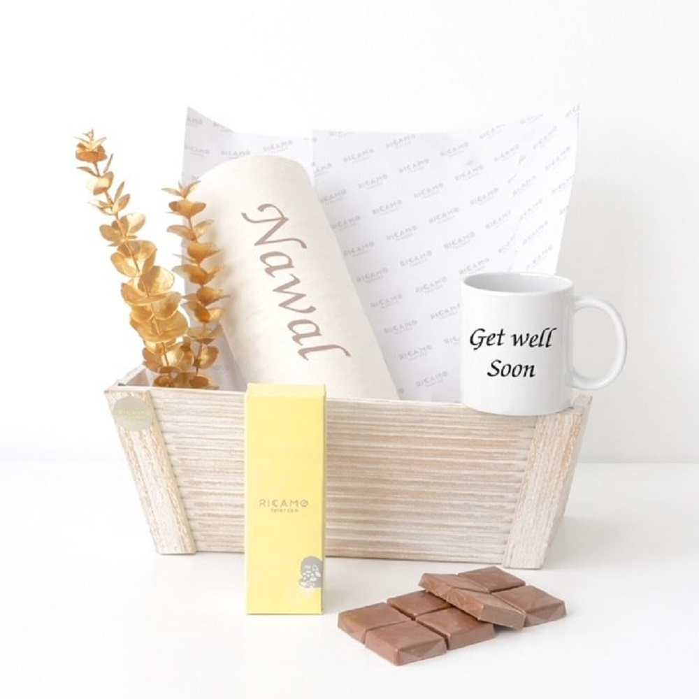 سله مميزة تحتوي على بطانية، مرش، الشوكولاتة وكوب مع الاسم المخصص وتغليف مميز للهدية.