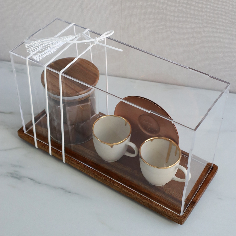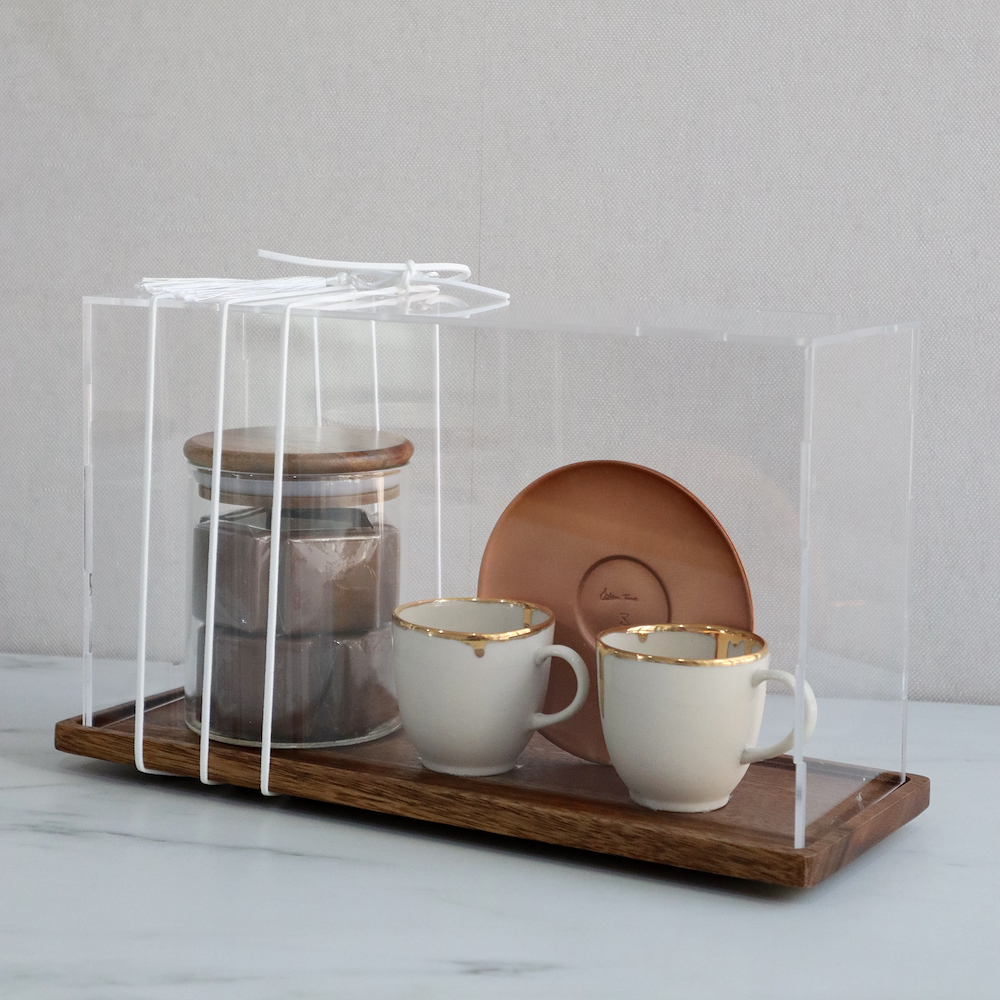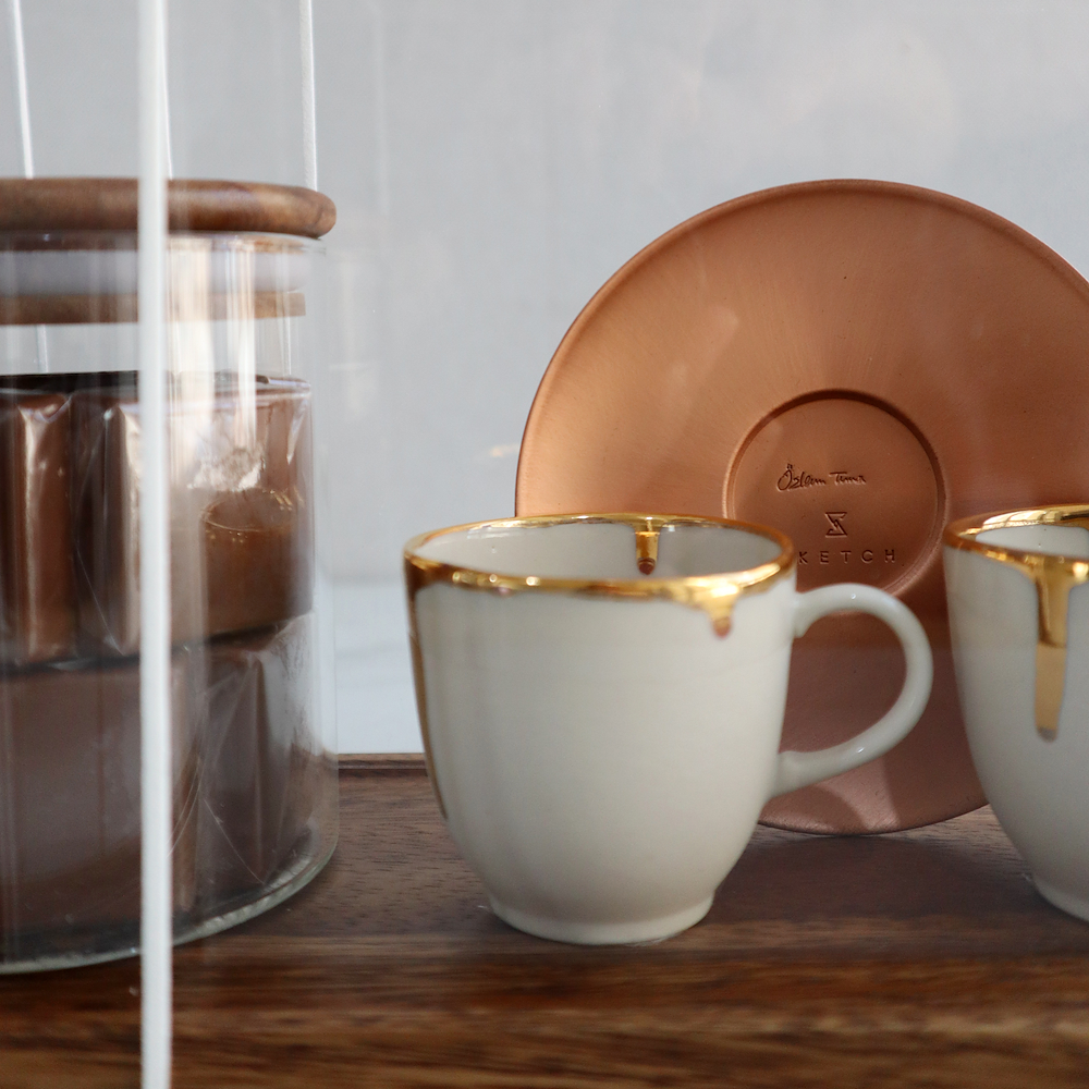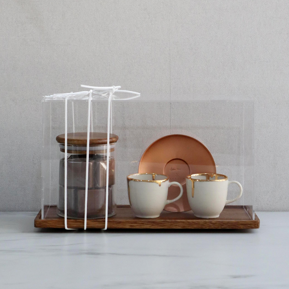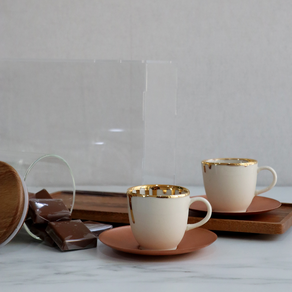 مجموعة دافئة وأنيقة مصممة للحظات اليومية الهادئة، تجمع مجموعة القهوة المزدوجة باللون الذهبي الوردي بين فناجين بورسلان مصنوعة يدوياً بتفاصيل ذهبية ناعمة وصحون بلون الذهبي الوردي، مع برطمان من الشوكولاتة ليكمل التجربة. مثالية لقهوة الإسبريسو أو القهوة التركية، سواء للإستمتاع الشخصي أو كهدية مميزة. حجم الفنجان: 5.3 × 5.5 سم (75 مل). حجم الصحن: 10 سم.