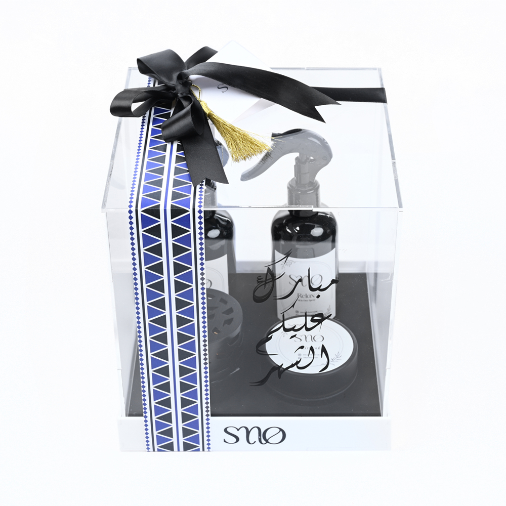 بوكس أكريليك يحتوي على مرش سوفت 250مل ( بودر - لينن)، مرش ريلاكس 250مل ( لافندر - لبان)، 3 توله من سنو معمول (مزيج فرنسي وعربي)، مبخر خشبي، زهور جوري باللون الوردي.