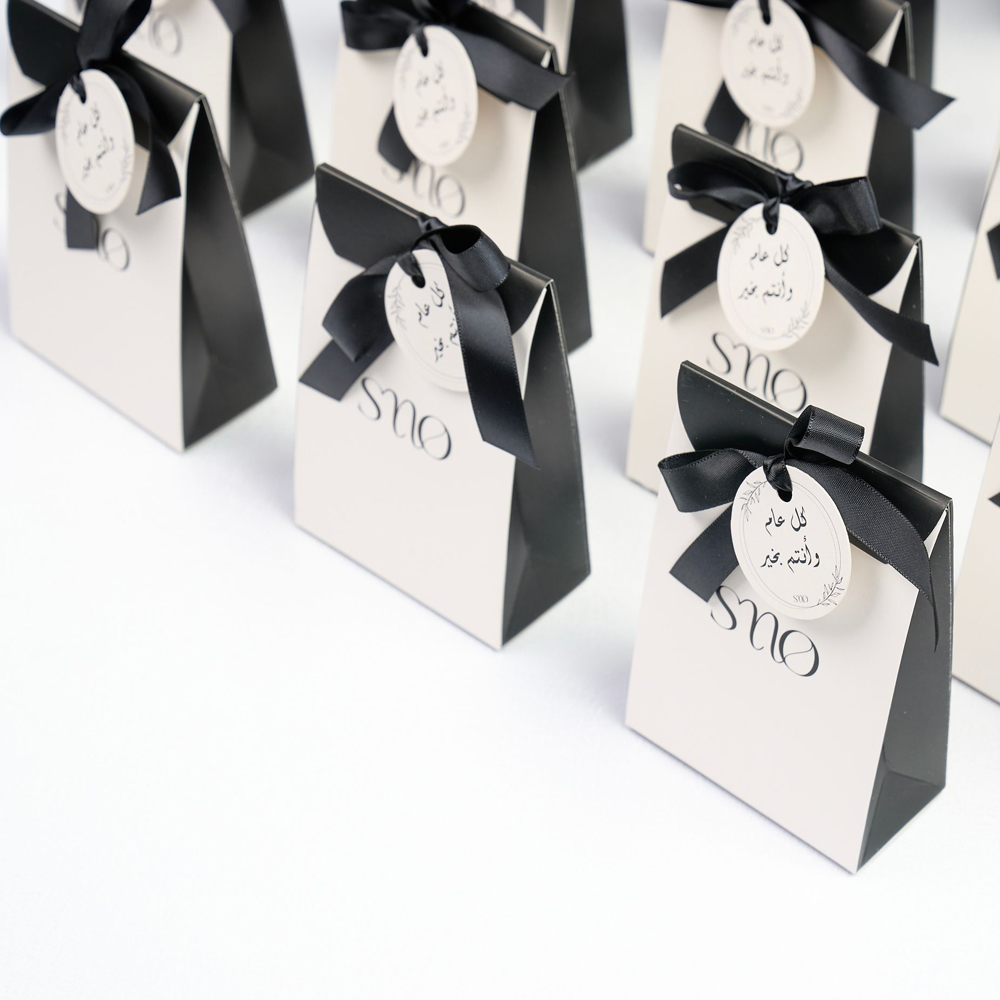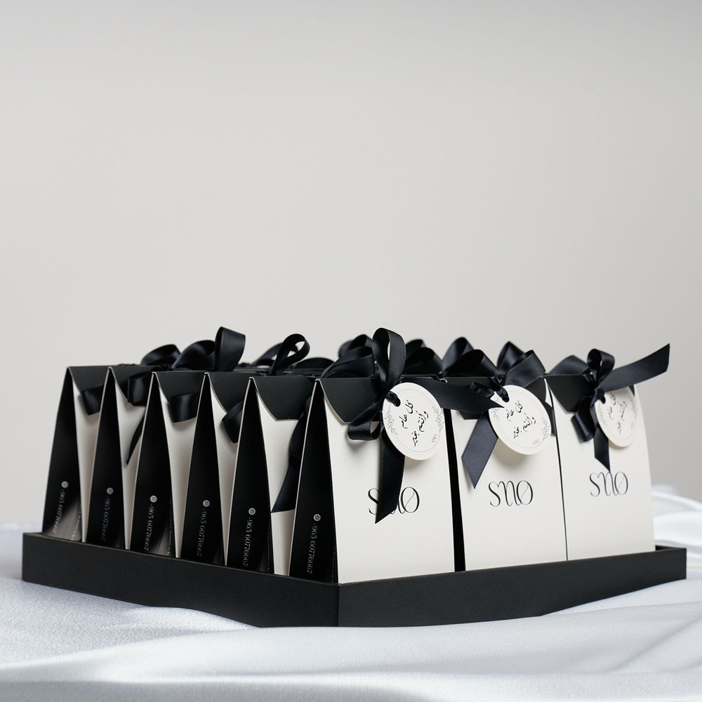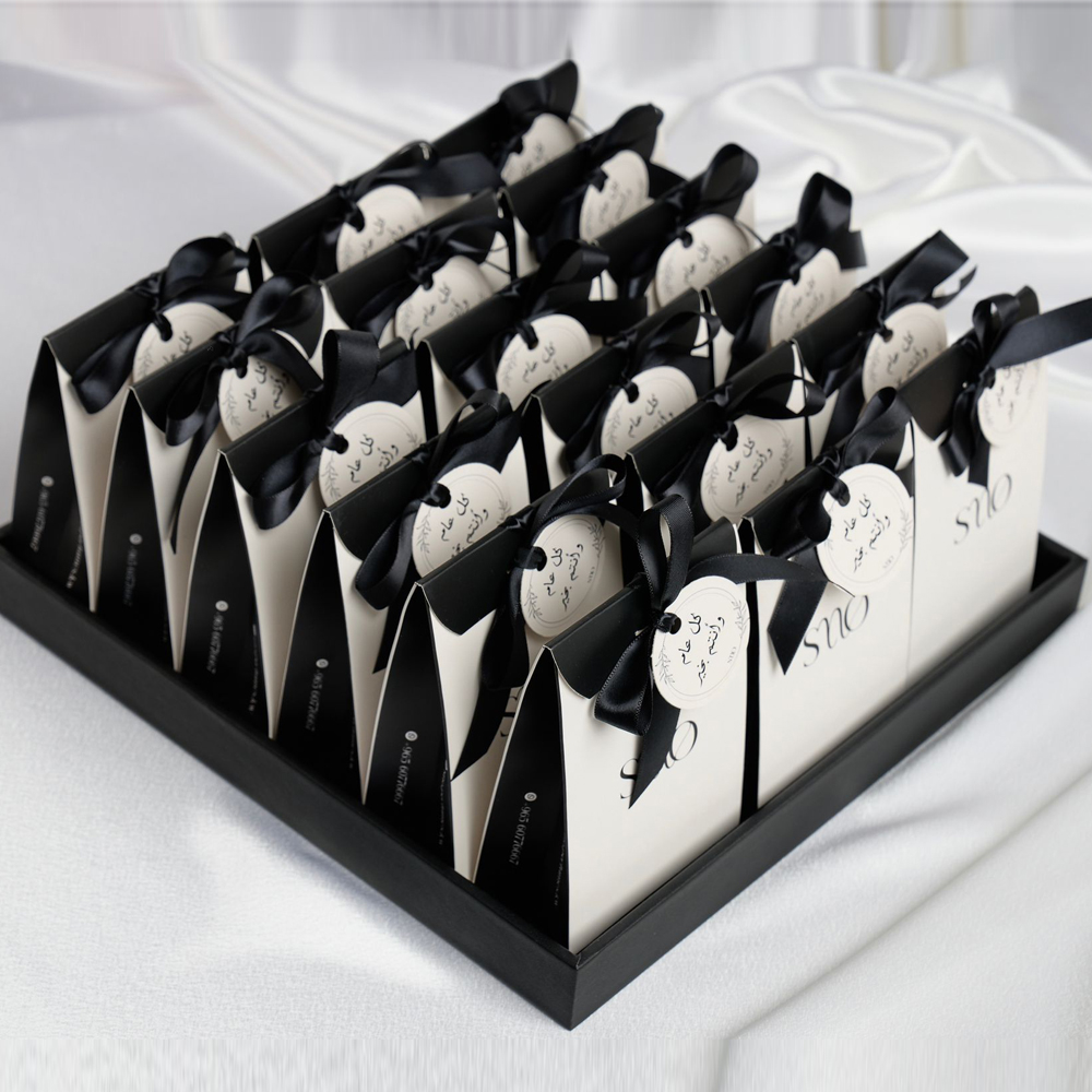صينية تحتوي على 18 حبة من توزيعات مسك سنو ( ربع تولة)، (ممكن طباعة جملة قصيرة على كرت التوزيعات).