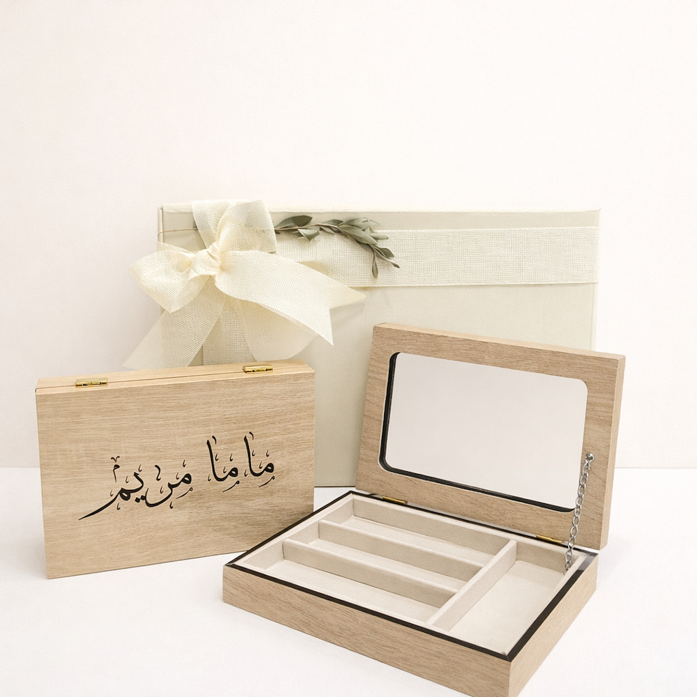 علبة مجوهرات "يوم الأم" مزودة بمرآة مع الاسم المخصص المنقوش.