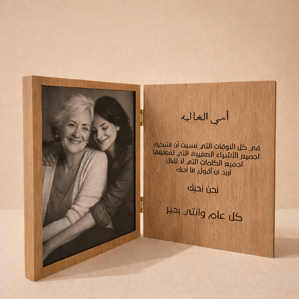 احتفل بالرابطة الجميلة بين الأم وطفلها مع هذا الإطار الخشبي الأنيق للصور. يتميز بتصميم خشبي طبيعي أنيق يفتح مثل الكتاب، حيث يحتوي على رسالة مؤثرة في جهة وصورة مميزة في الجهة الأخرى. تصميمه البسيط والمعبر يجعله قطعة تذكارية رائعة لحفظ أجمل اللحظات والتعبير عن الحب والتقدير للأم. هدية مثالية ليوم الأم أو أعياد الميلاد أو أي مناسبة خاصة للتعبير عن حب الأم.