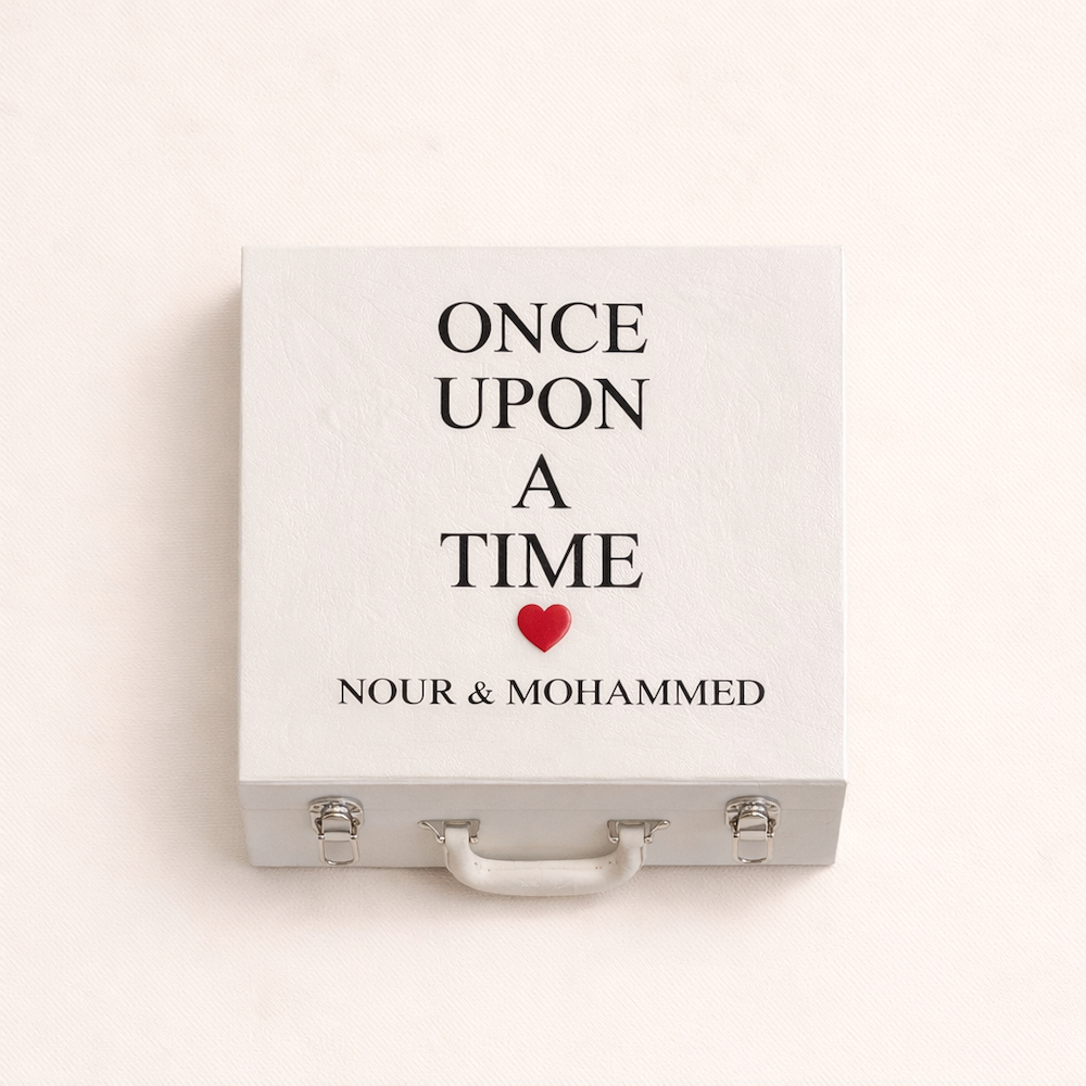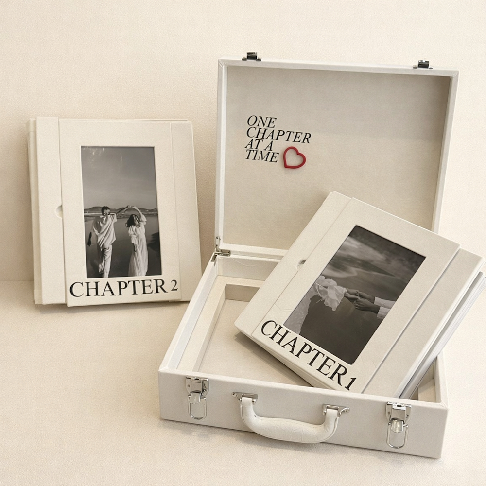 تصوير بأسلوب بسيط وناعم يحكي قصة حب هادئة. إطارات بيضاء تحمل عنوان (Chapter) و (Chapter 1) تضم صورًا بالأبيض والأسود لزوجين في لحظات عاطفية صادقة. صندوق أبيض مفتوح يظهر عبارة «فصلًا بعد فصل» مزينة بقلب أحمر صغير، في إشارة إلى رحلة الحب خطوة بخطوة. زهور التوليب الحمراء تمتد برقة فوق الإطارات، مضيفة لمسة دافئة ترمز إلى الحب، النمو، والبدايات الجديدة.