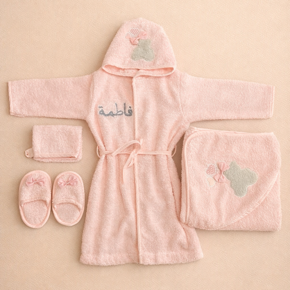 مجموعة مصممة لتغمر طفلك بالراحة واللطافة، تضم طقم استحمام للاطفال يحتوي على روب بمنشفة بغطاء رأس ناعم مع شباشب متطابقة، لتبقي طفلك دافئا وسعيدا وأنيقا بعد وقت الاستحمام.