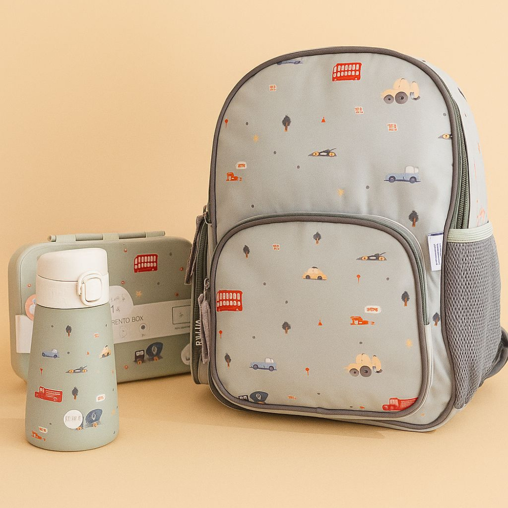 طقم مستوحى من السيارات يحتوي على حقيبة ظهر ترانسبورت خفيفة الوزن بحمالات مبطنة قابلة للتعديل مناسبة لحمل مستلزمات المدرسة أو احتياجات عطلة نهاية الأسبوع وزجاجة ماء ترانسبورت ستانلس بسعة 350 مل تحافظ على المشروبات الساخنة أو الباردة لساعات ومقاومة للانسكاب مع علبة غذاء ترانسبورت تريتان مقسمة إلى 4 خانات لسهولة تنظيم الوجبات.