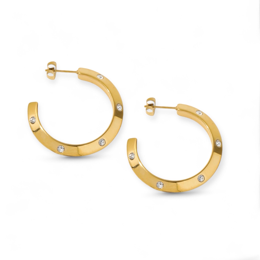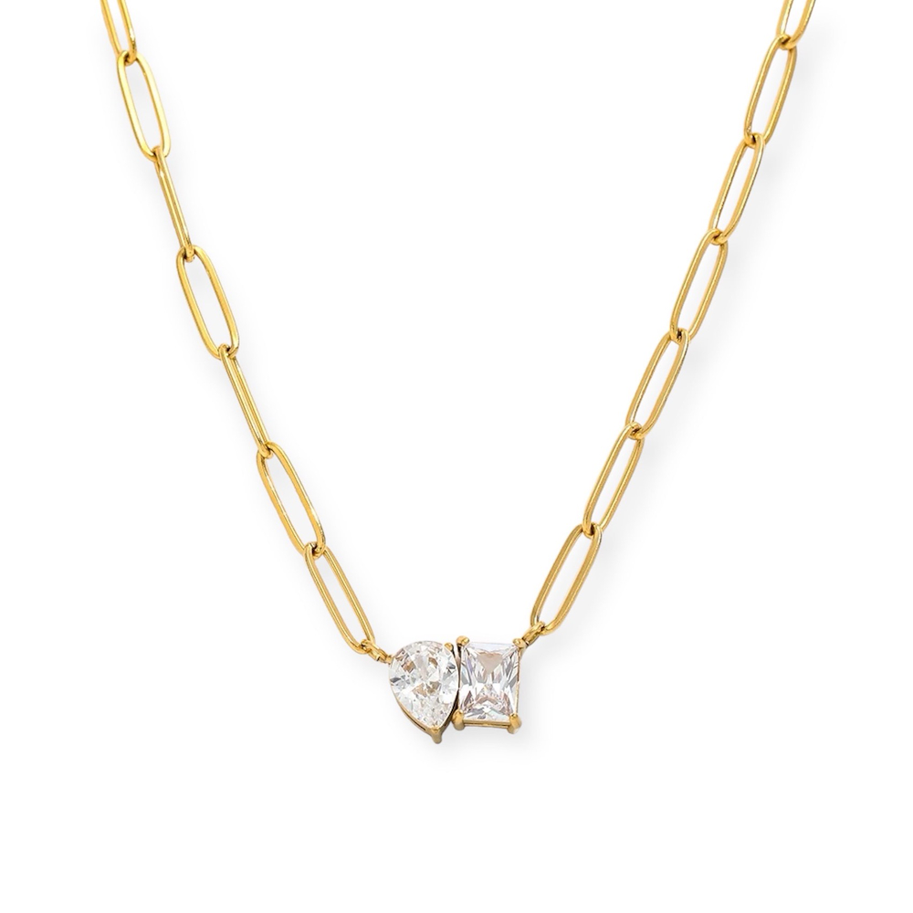 مجموعة تضم قلادة من ستانلس ستيل عيار 18 عالية الجودة مزينة بحجر زركون شفاف، مع أقراط مستديرة مطابقة. مقاومة للماء ولا يتغير لونها مع الاستخدام.