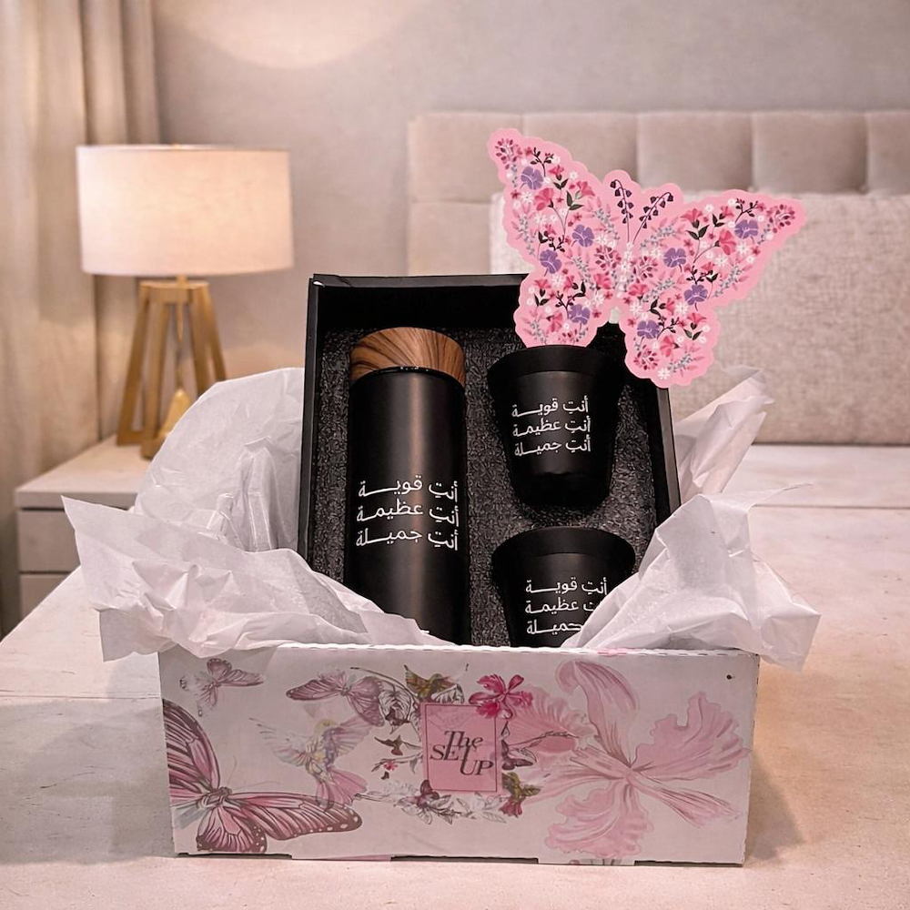 علبتنا الخاصة مع طقمنا الجديد المخصص من الأكواب الحرارية بالإضافة إلى كوبين.