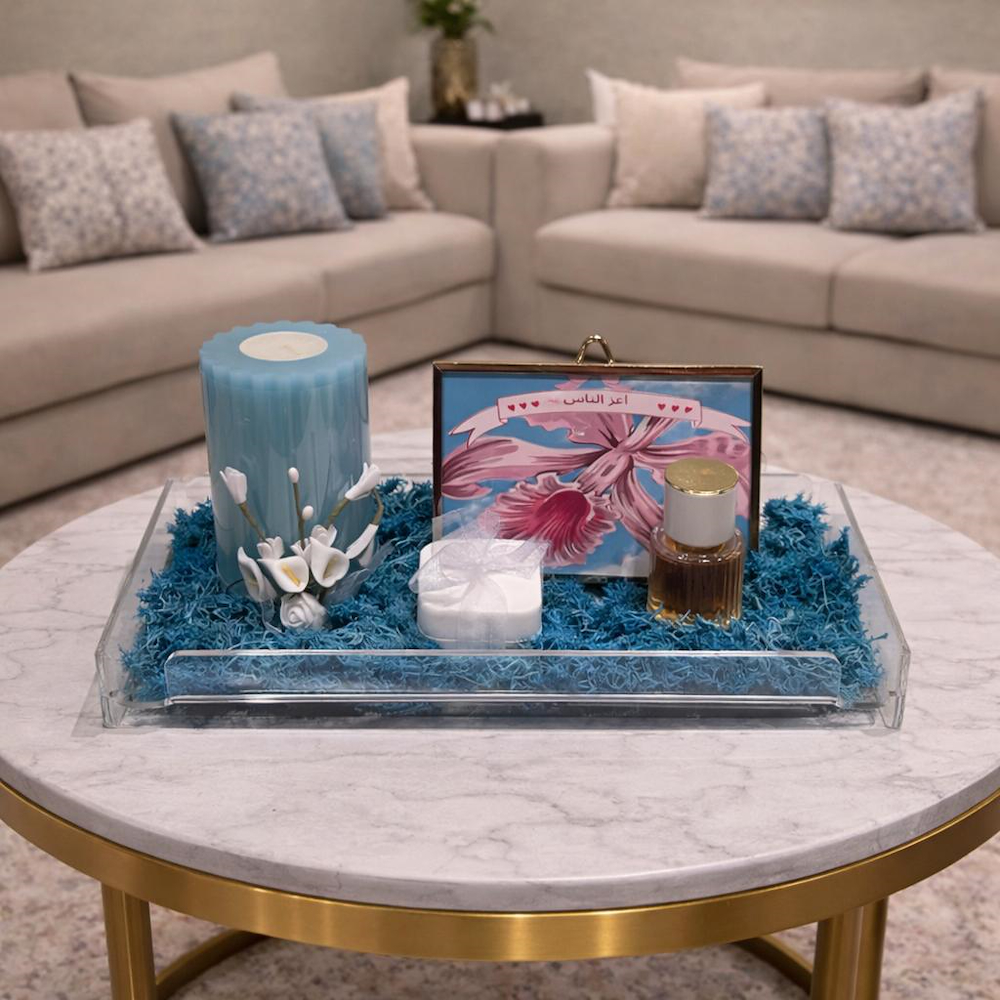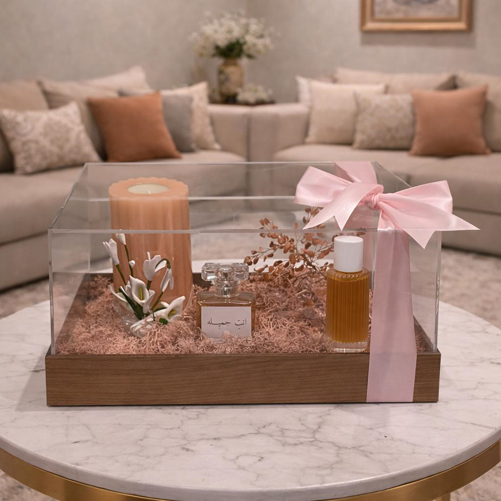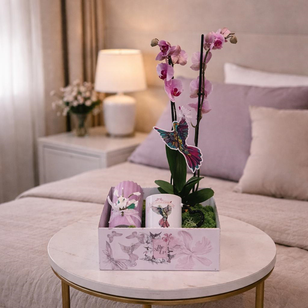 سلة وردية متوسطة الحجم تحتوي على بخاخ معطر منزلي خاص بنا، وكوب حراري وردي، ومرآة بإطار، وكوب بتصميم فراشة، وبطاقة الفراشة الخاصة بنا.