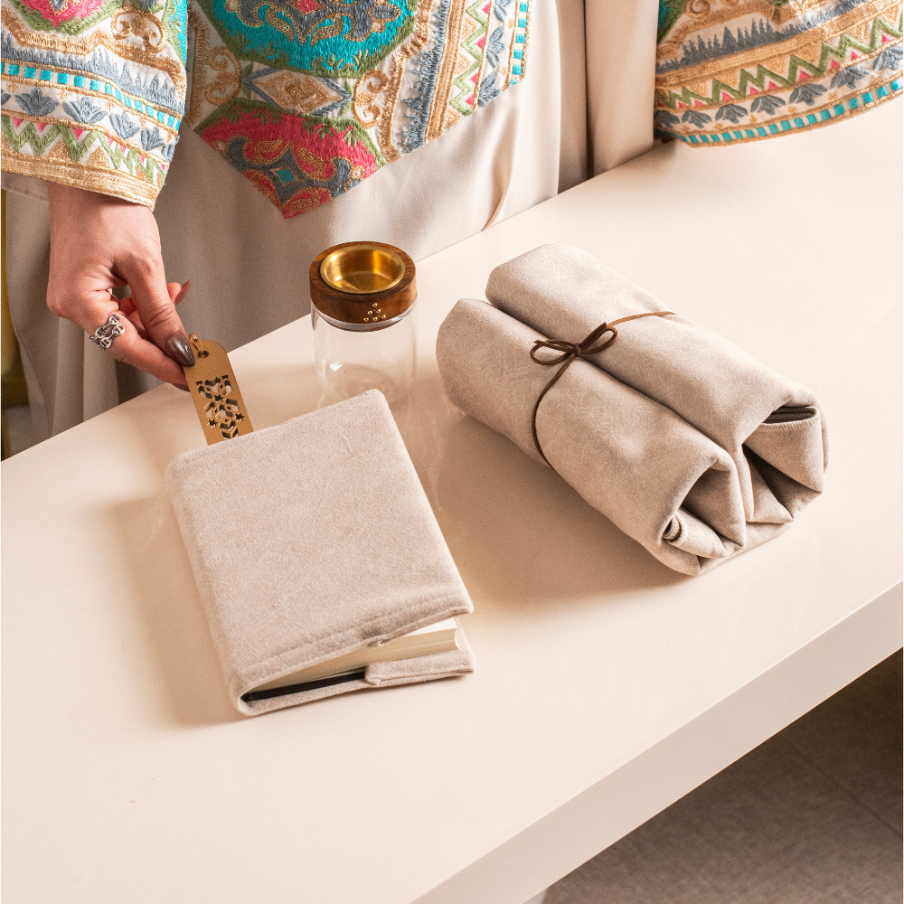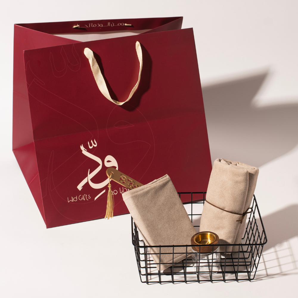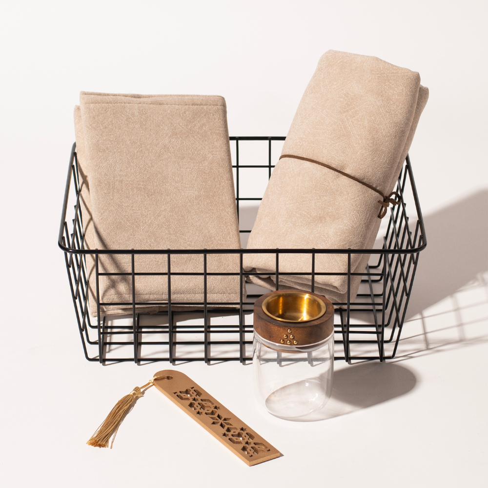مجموعة هدايا أنيقة تضم سلة معدنية باللون الاسود، سجادة صلاة خفيفة، مصحف شريف، مبخر زجاجي مع غطاء خشبي، وفاصل خشبي للمصحف.