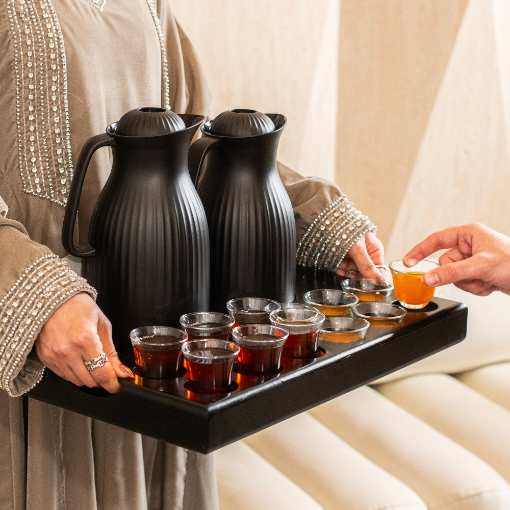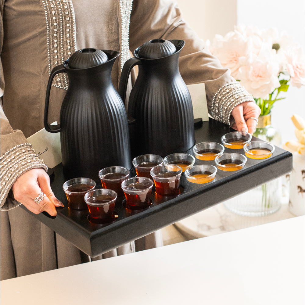 نقصة ضيافة راقية تحتوي على: - دلتين باللون الأسود. - صينية خشبية باللون الأسود. - 6 فناجين قهوة عربية. - 6 إستكانات شاي. - ستاندين كروت. - 7 كروت (شاي، قهوة، حليب، أعشاب، كرك، حياكم الله، بالعافية).