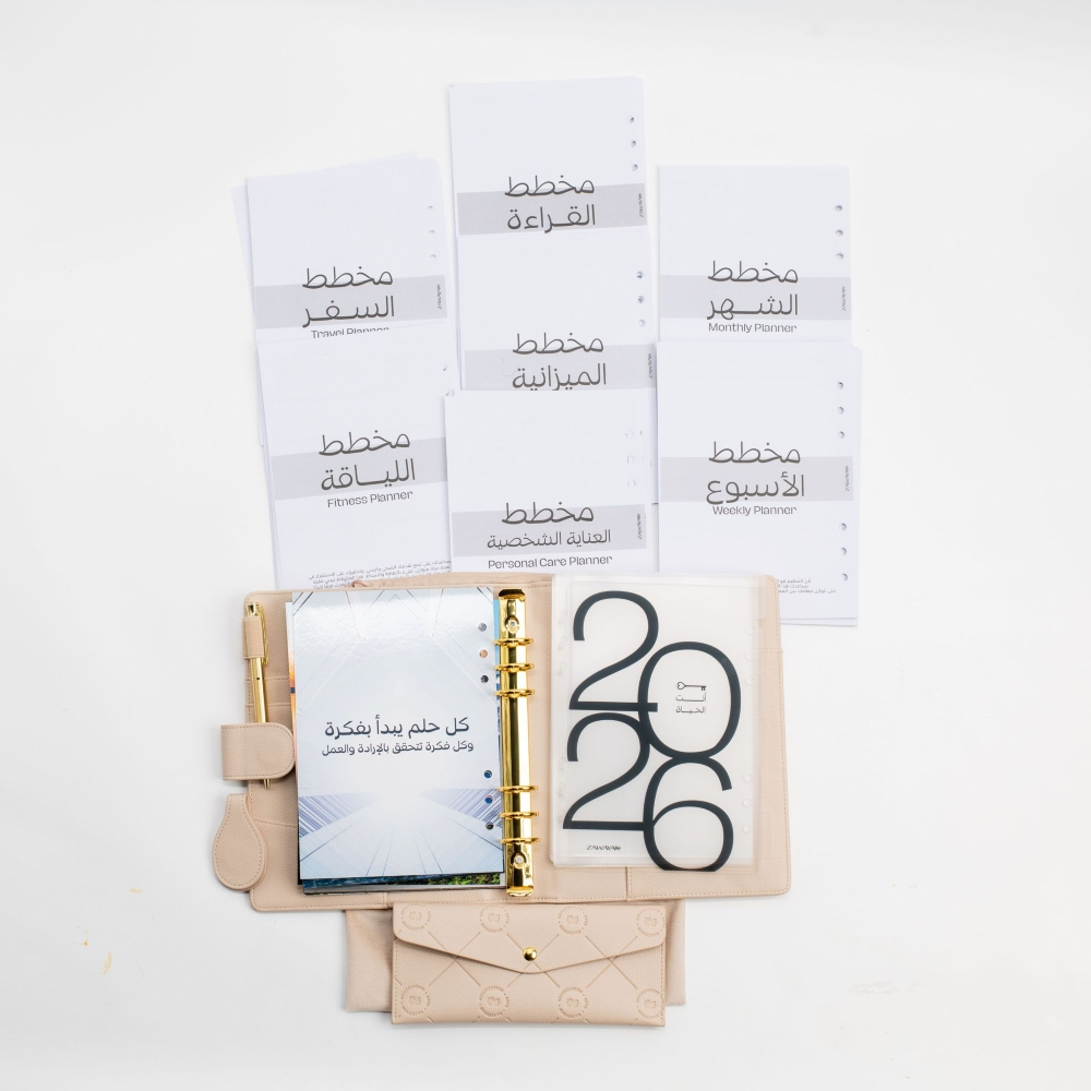 مجموعة بالانس من زاوايا هي مجموعتك المتكاملة المصممة لتحقيق التوازن بين العمل والحياة وبين الانتاجية والراحة، حيث تجمع بين ادوات تخطيط تغطي جميع جوانب يومك من الصحة والميزانية الى السفر والعناية الذاتية، لتمنحك وضوحا وتنظيما وتجربة تخطيط اسهل على مدار العام، مع غلاف من الجلد النباتي الفاخر بحلقات ذهبية، ومفكرة للياقة a5، ومفكرة للميزانية a5، ومفكرة شهرية a5، ومفكرة للعناية الذاتية a5، ومفكرة للسفر a5، ومفكرة اسبوعية a5، ومفكرة للقراءة a5، وظروف للادخار، واكسسوارات لمفكرات التخطيط من الاكريليك، وفواصل تحفيزية، وقلم حبر ذهبي.