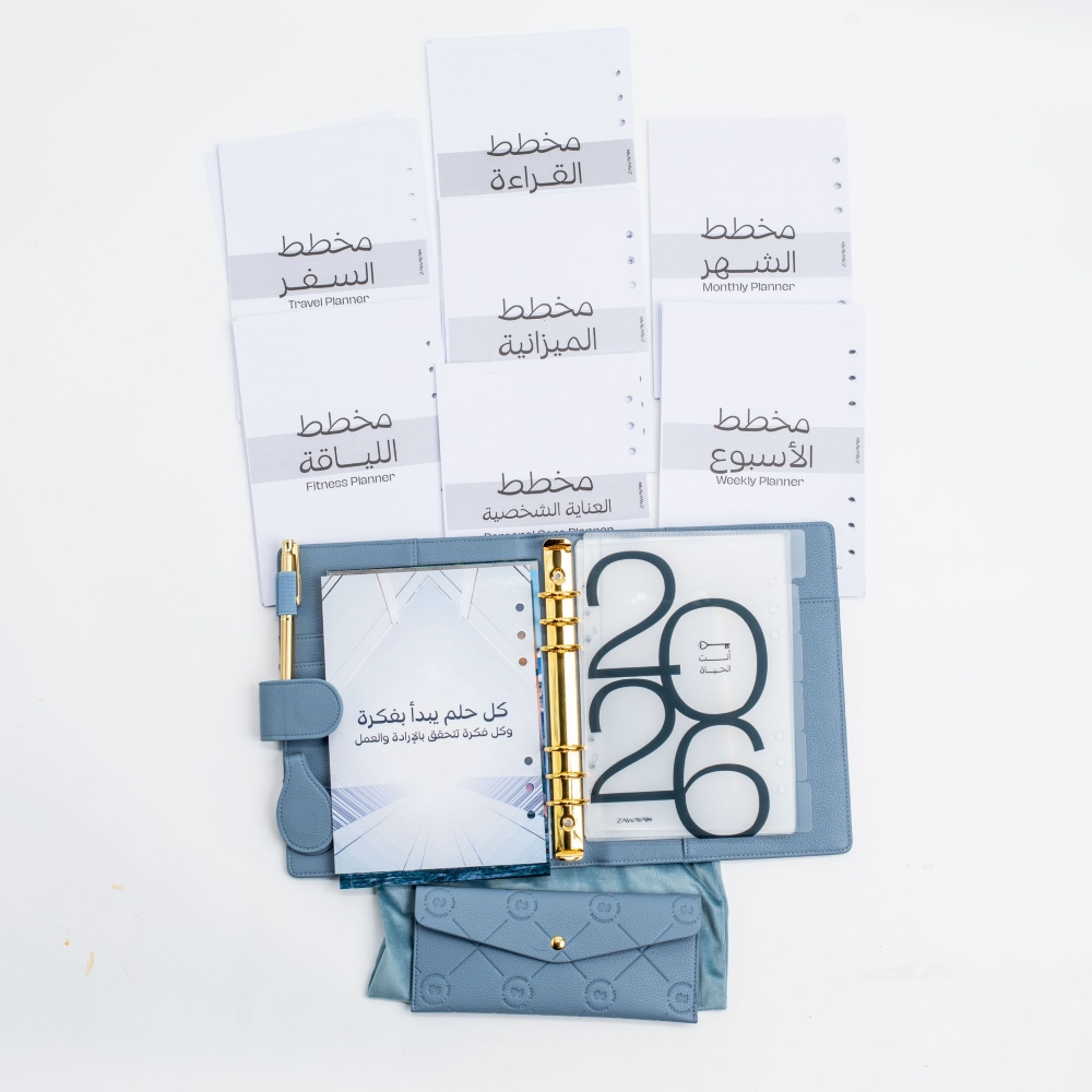مجموعة بالانس من زاوايا هي مجموعتك المتكاملة المصممة لتحقيق التوازن بين العمل والحياة وبين الانتاجية والراحة، حيث تجمع بين ادوات تخطيط تغطي جميع جوانب يومك من الصحة والميزانية الى السفر والعناية الذاتية، لتمنحك وضوحا وتنظيما وتجربة تخطيط اسهل على مدار العام، مع غلاف من الجلد النباتي الفاخر بحلقات ذهبية، ومفكرة للياقة a5، ومفكرة للميزانية a5، ومفكرة شهرية a5، ومفكرة للعناية الذاتية a5، ومفكرة للسفر a5، ومفكرة اسبوعية a5، ومفكرة للقراءة a5، وظروف للادخار، واكسسوارات لمفكرات التخطيط من الاكريليك، وفواصل تحفيزية، وقلم حبر ذهبي.
