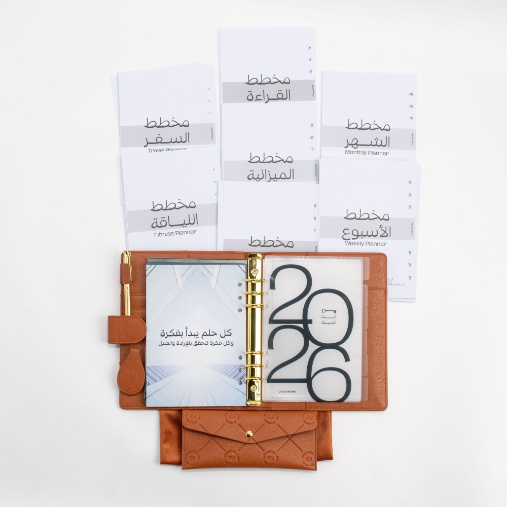 مجموعة بالانس من زاوايا هي مجموعتك المتكاملة المصممة لتحقيق التوازن بين العمل والحياة وبين الانتاجية والراحة، حيث تجمع بين ادوات تخطيط تغطي جميع جوانب يومك من الصحة والميزانية الى السفر والعناية الذاتية، لتمنحك وضوحا وتنظيما وتجربة تخطيط اسهل على مدار العام، مع غلاف من الجلد النباتي الفاخر بحلقات ذهبية، ومفكرة للياقة a5، ومفكرة للميزانية a5، ومفكرة شهرية a5، ومفكرة للعناية الذاتية a5، ومفكرة للسفر a5، ومفكرة اسبوعية a5، ومفكرة للقراءة a5، وظروف للادخار، واكسسوارات لمفكرات التخطيط من الاكريليك، وفواصل تحفيزية، وقلم حبر ذهبي.